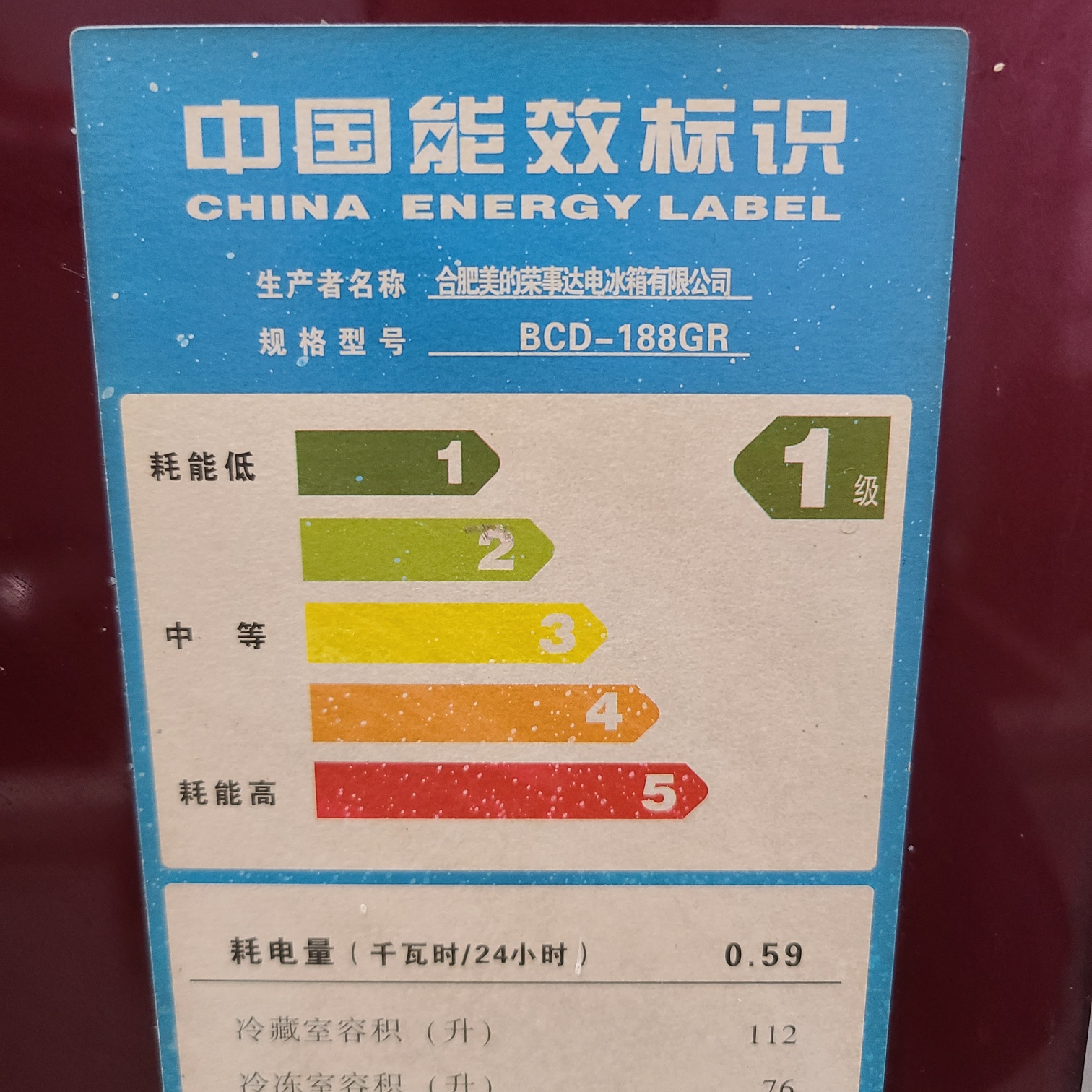 荣事达冰箱188升一级能效