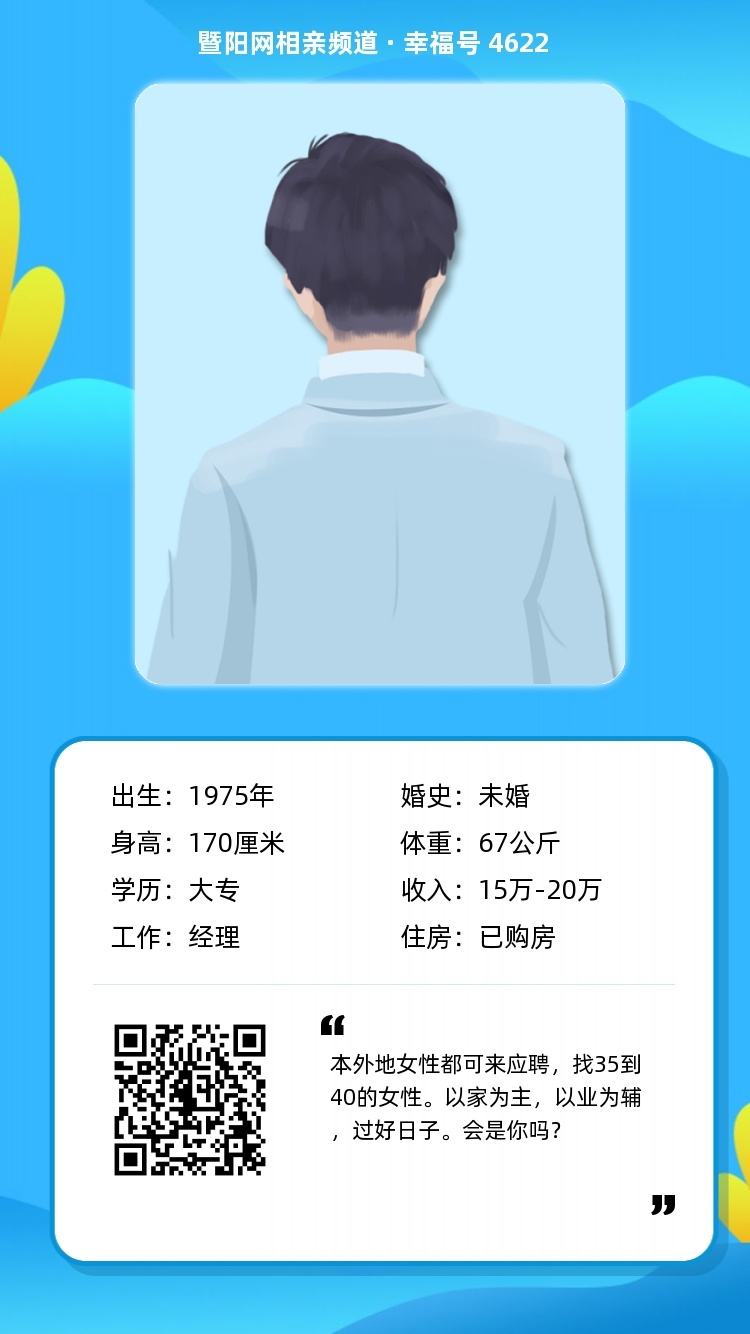怎么感觉不真实呢?还“本人性格随女方而定”,多荒唐的字眼,49岁的男人,还没活出个性,没有自我。还是要女方“应聘”,你开公司哪,选妃啊!什么恶心的东东啊,还出来现世!