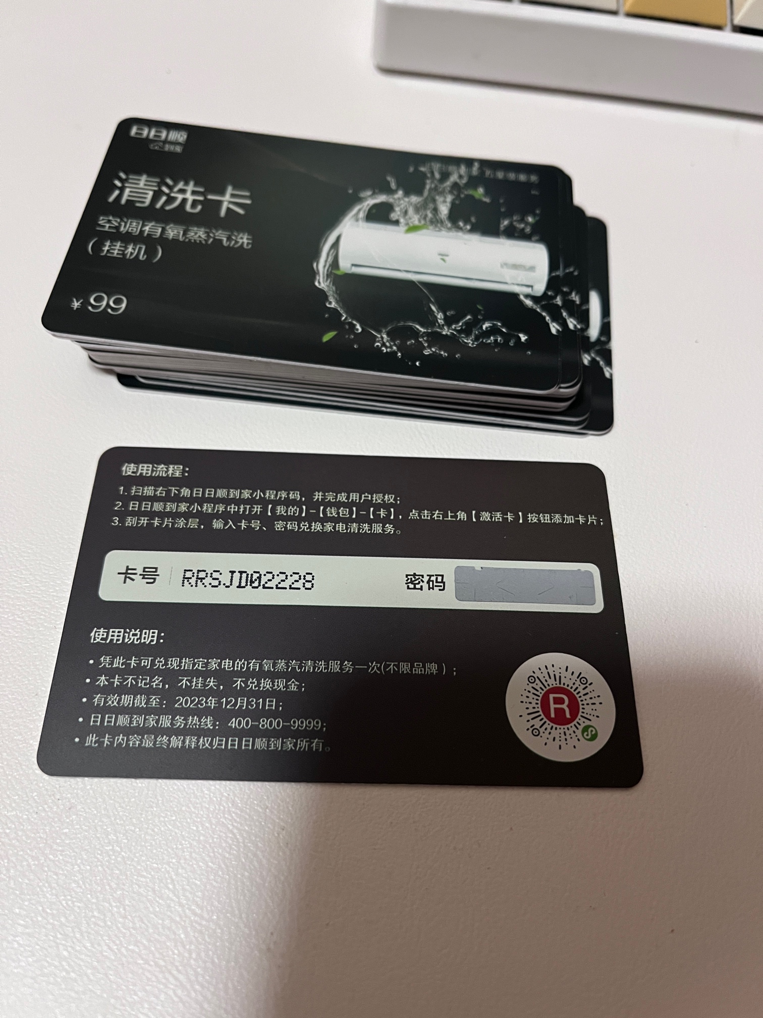 使用说明在卡背后(微信扫码,小程序下单,海尔旗下的日日顺服务)有效期23年12月31日,50元/张。