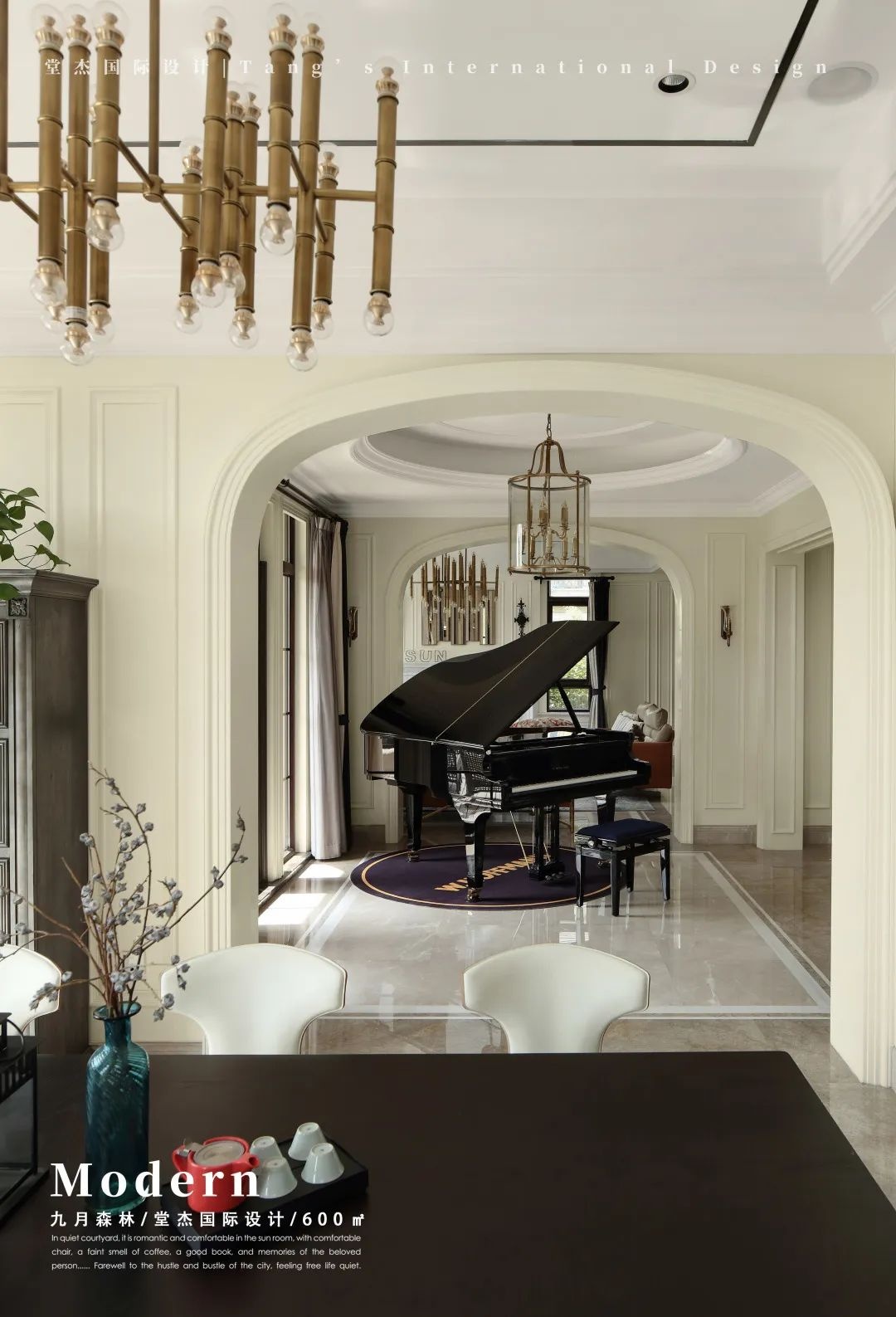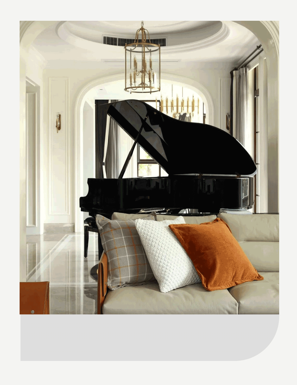 会客厅连接钢琴房,中间以拱形门过渡,两处看似没有联系,实则相互搭配,营造出一种轻欧式家庭的仪式感。