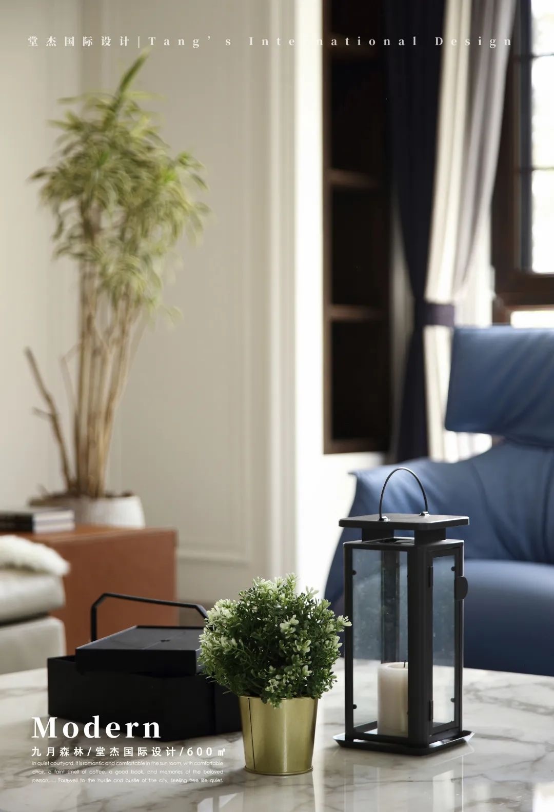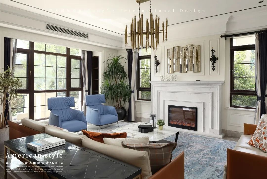 此外,真火炉壁、茶几上摆放的满天星和提灯、落地式格形窗户、繁茂的大型盆栽、柱形垂坠吊灯等聚合出一种独特的温暖质感。