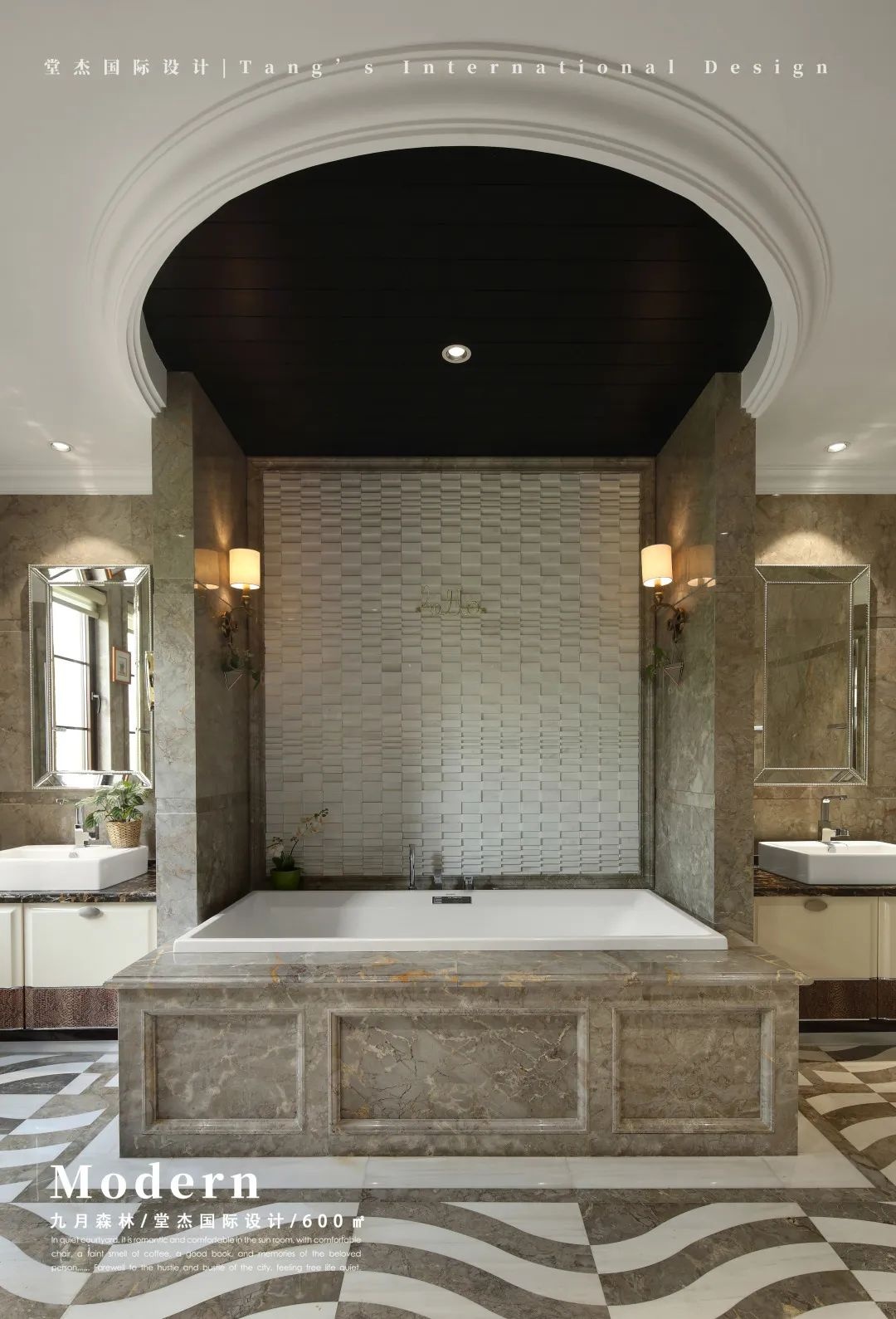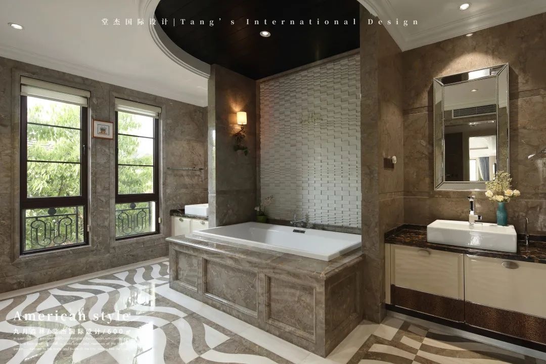 卫生间的布置很有格调,采用对称设计,在浴室两边分别设置一个洗手台,圆拱形浴室吊顶让卫浴在视觉上有所扩容感。墙面上的壁灯让空间有股淡淡的复古感。