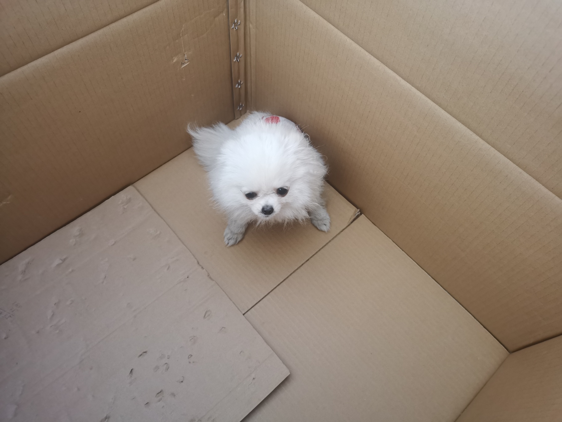 今天温德姆附近在马路当中捡了一只被车压了的小博美 找主人