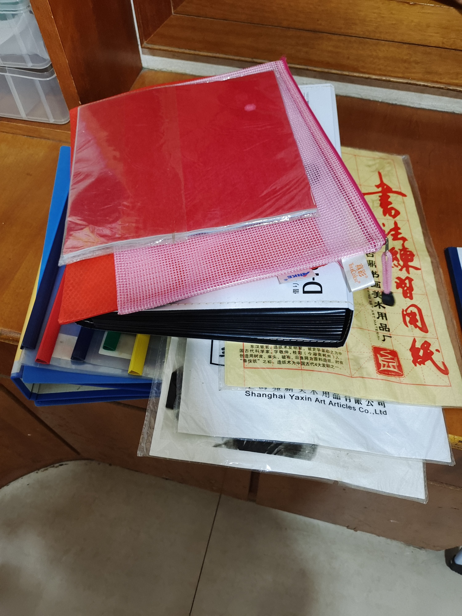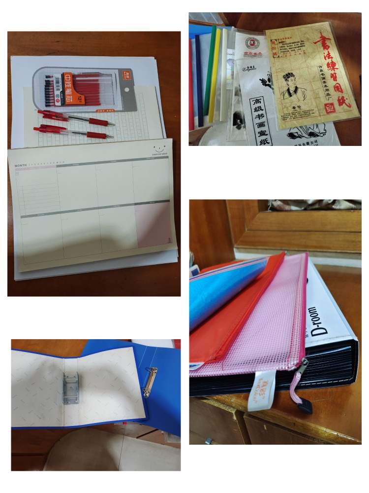 加厚风琴文件夹1个,拉链文件袋2个,抽杆文件夹个,高级书画宣纸3袋,A3打印纸20多张,彩色蜡光纸1包,笔记本7本,红色笔和笔芯若干,A4周计划拍纸本1本,写作拍纸本1本。