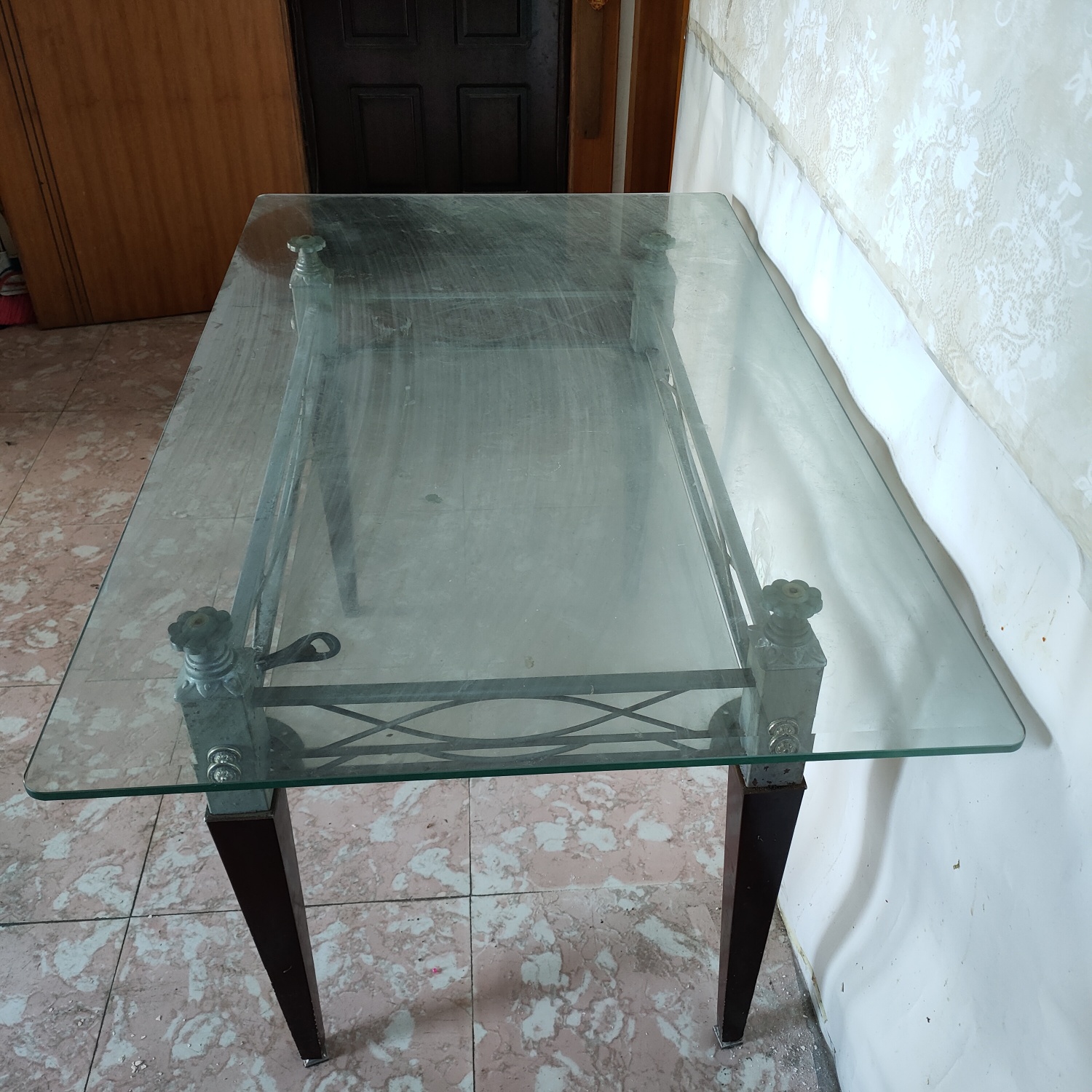 1.长方形钢化玻璃餐桌,尺寸长130宽80左右,玻璃1公分多厚度。