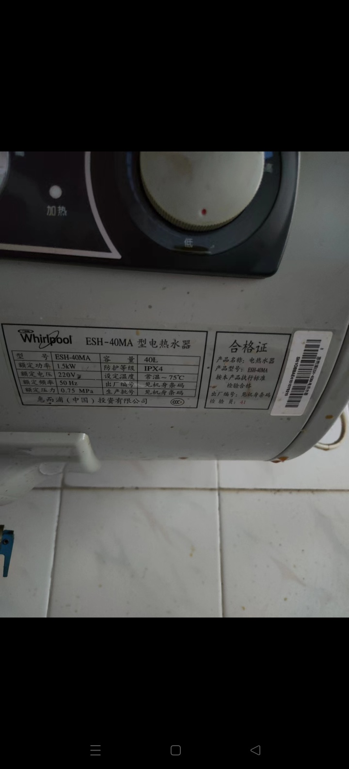 3.惠尔浦40升电热水器,功能正常,送一对原装膨胀螺丝。
