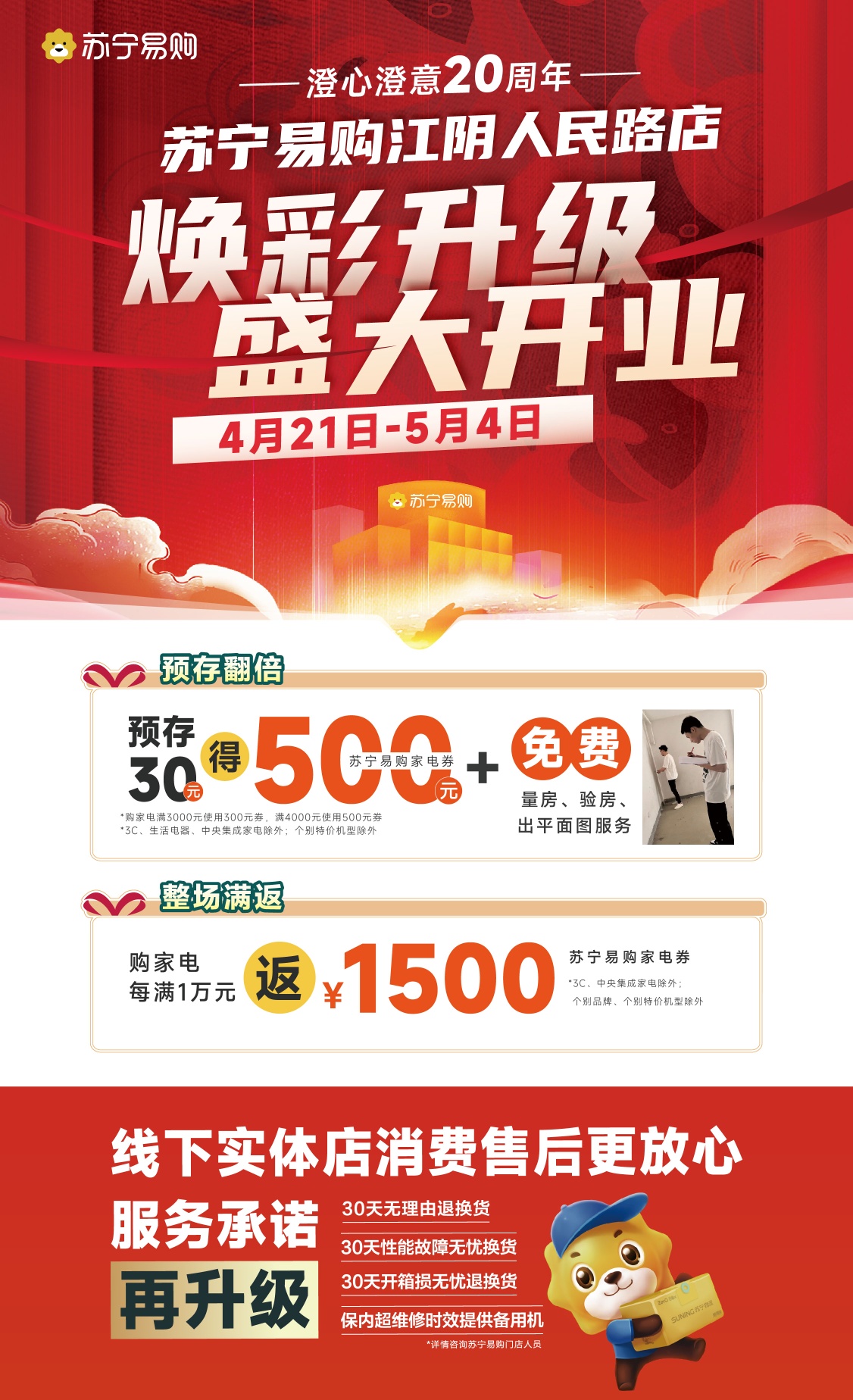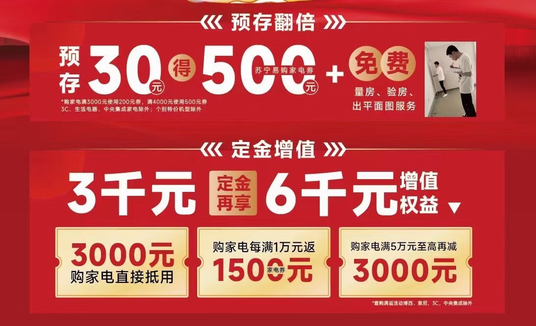 江阴步行街苏宁易购开业活动预存30最高得500元,单件满3000用300,满4000用500,还有每满1万返1500元,购物满5万预存3000元当6000元用,5万还返7500元 这个力度是我在家电行业20年未有过的,有需要联系15961536915