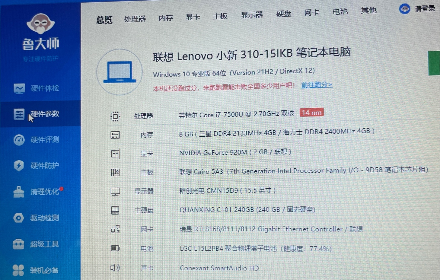 I7-7500处理器,8G内存,240固态硬盘,2G独立显卡,外观95新,使用功能一切正常!
