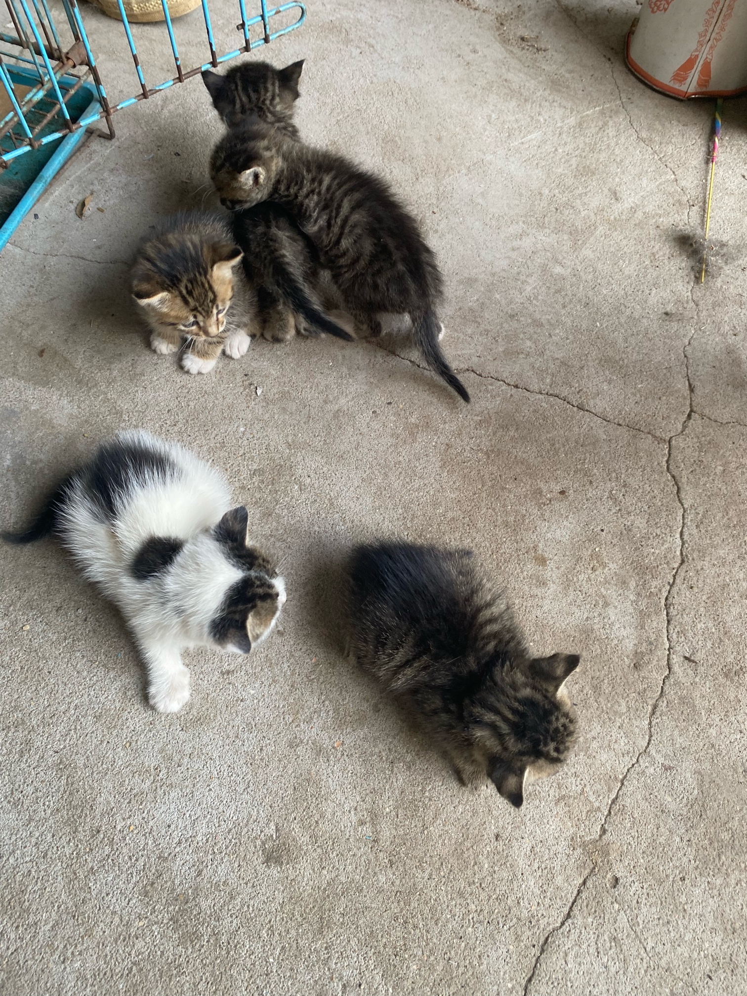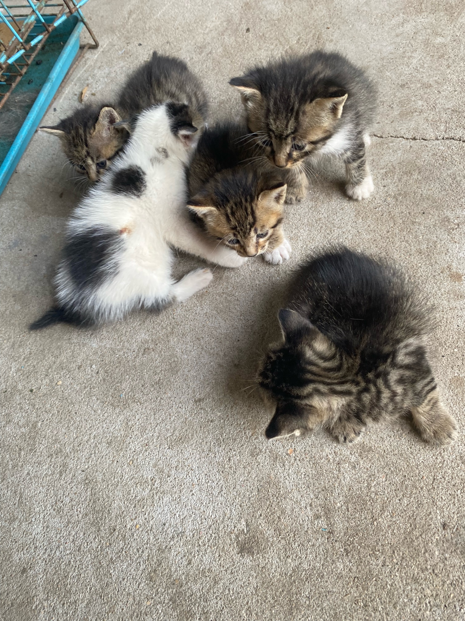 家里五只小猫,会自己吃东西了,四只狸花猫,一只奶牛猫