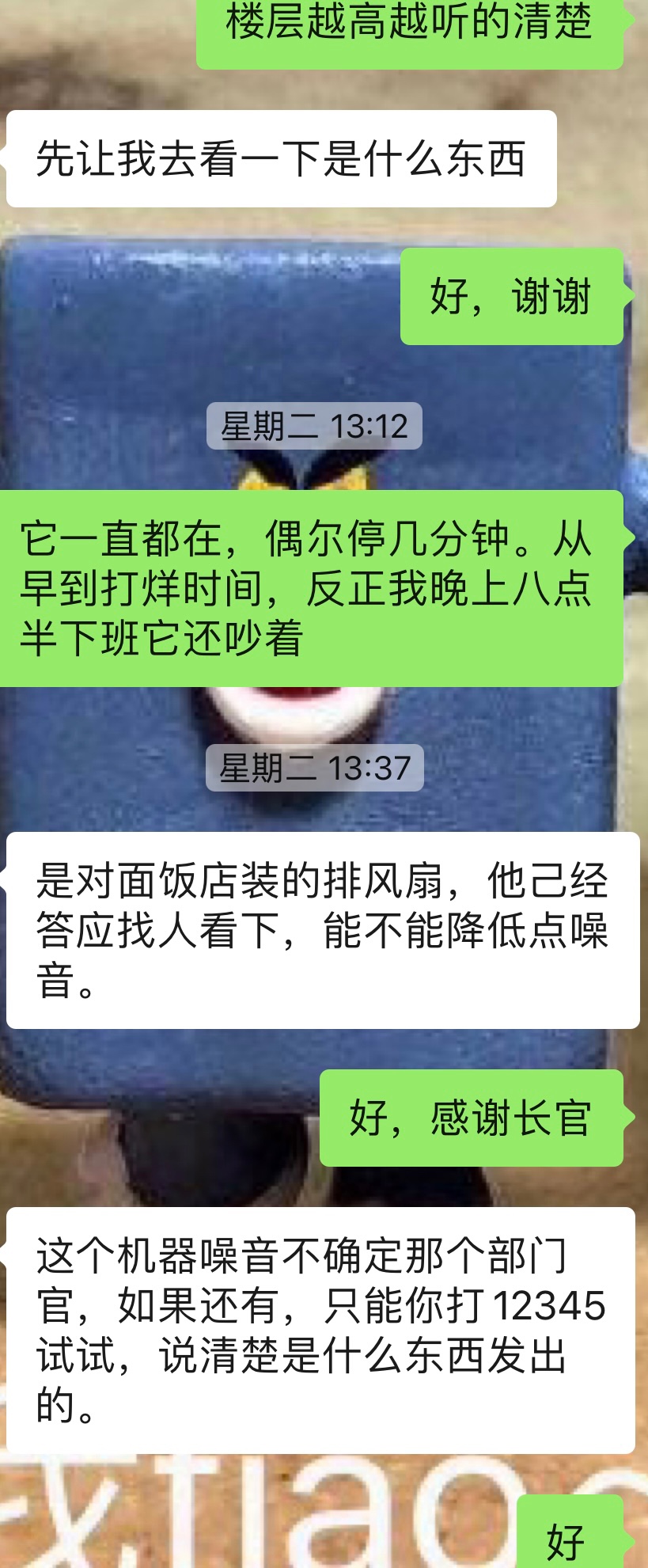 12345反馈电话来了,商家检测楼顶大风机出了故障,订购了新的大风机,三四天后到货安装,最近能不开就不开。大家都挺愉快的解决问题,挺给力。