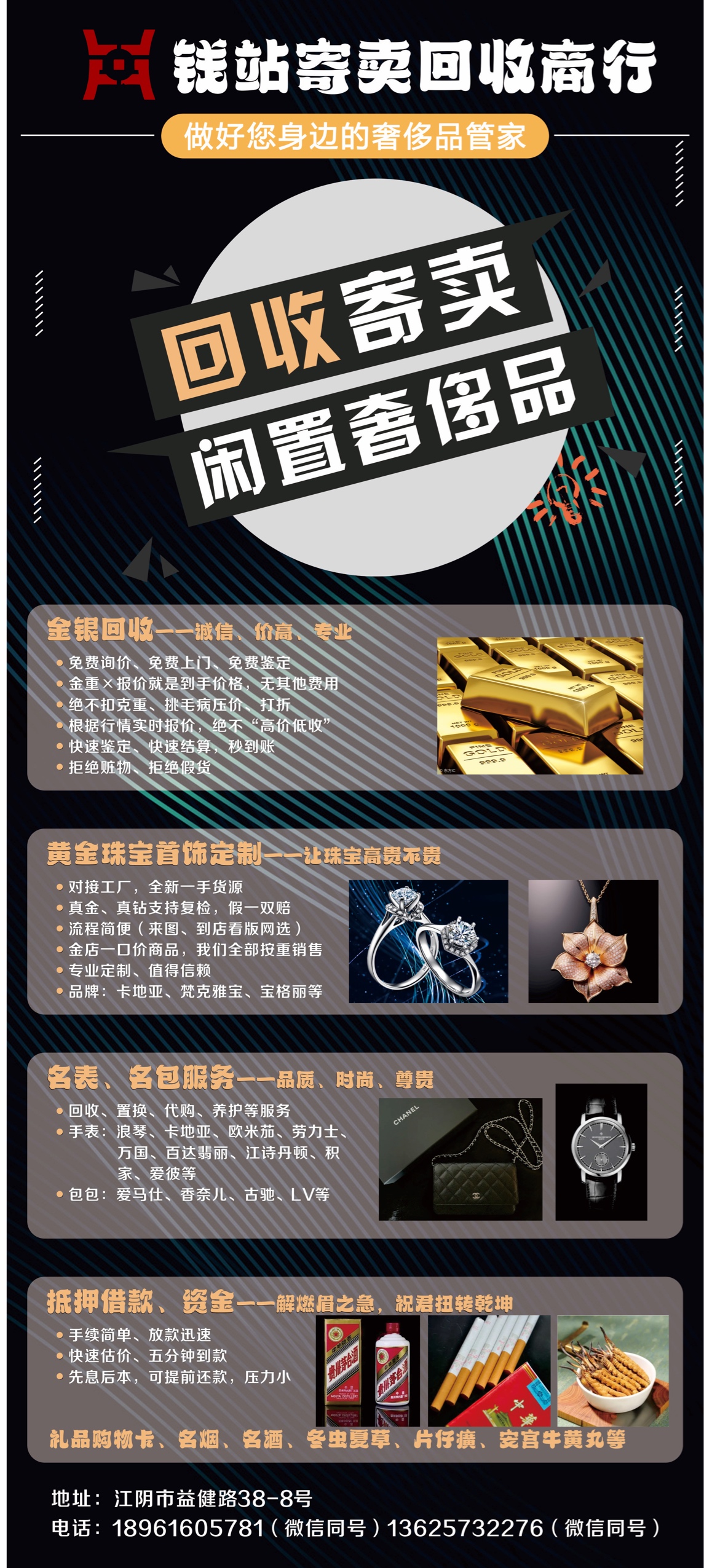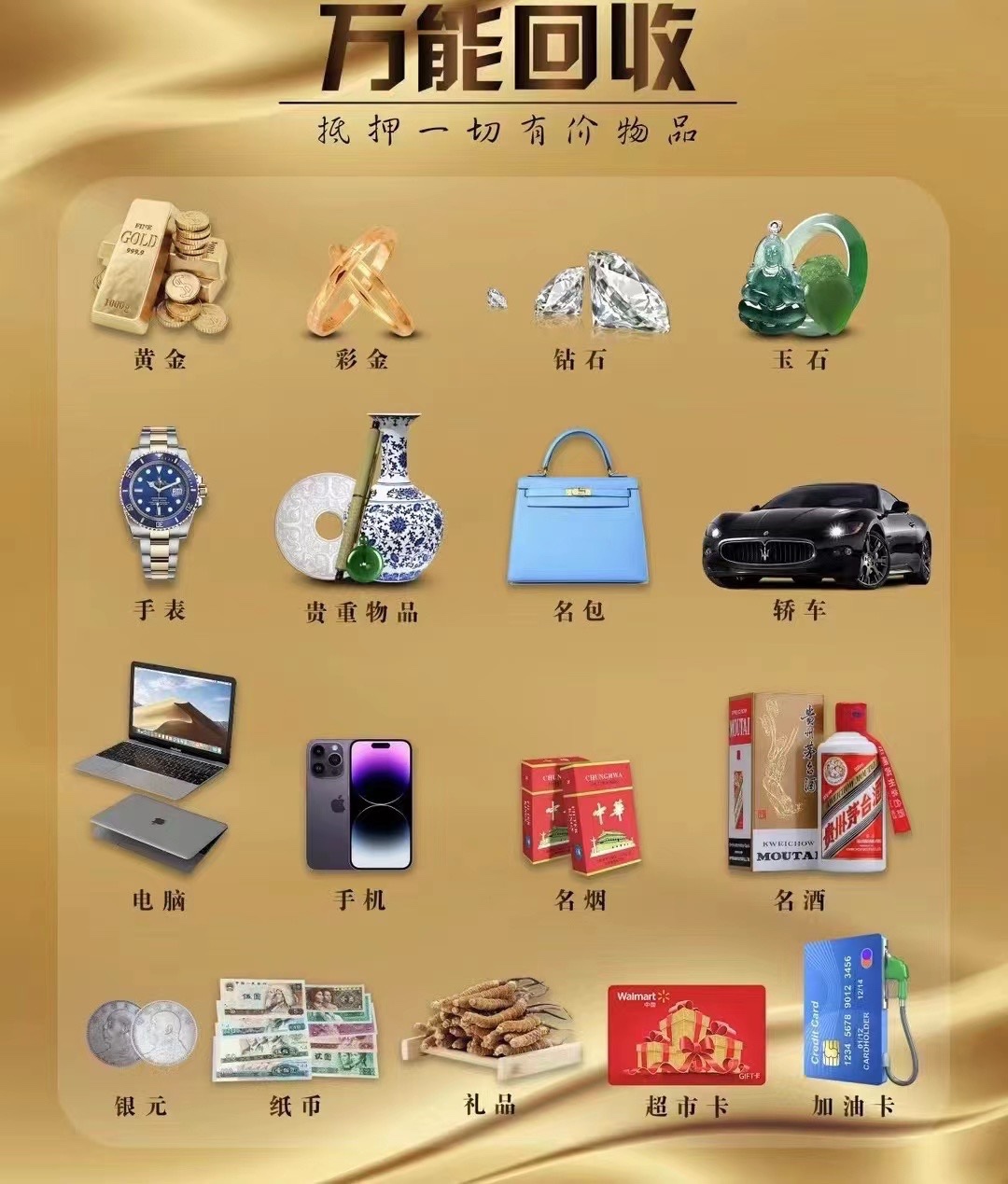 回收黄金、铂金、名表、名包、银元、数码、二手车,保管、套现等业务