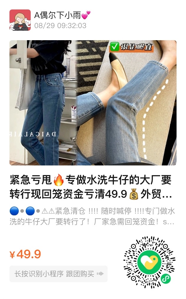 超柔软外贸尾单烟管牛仔裤49.9元