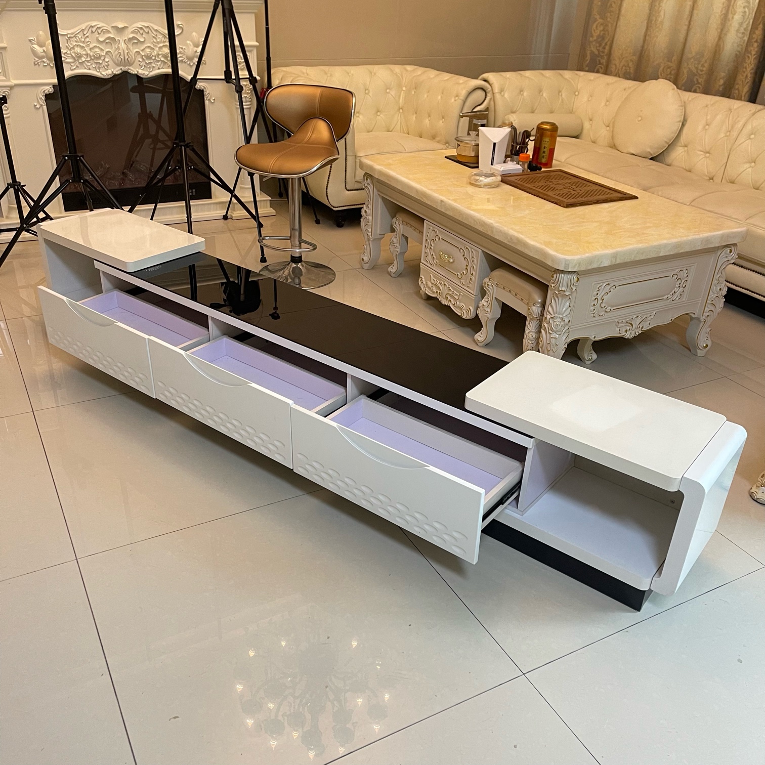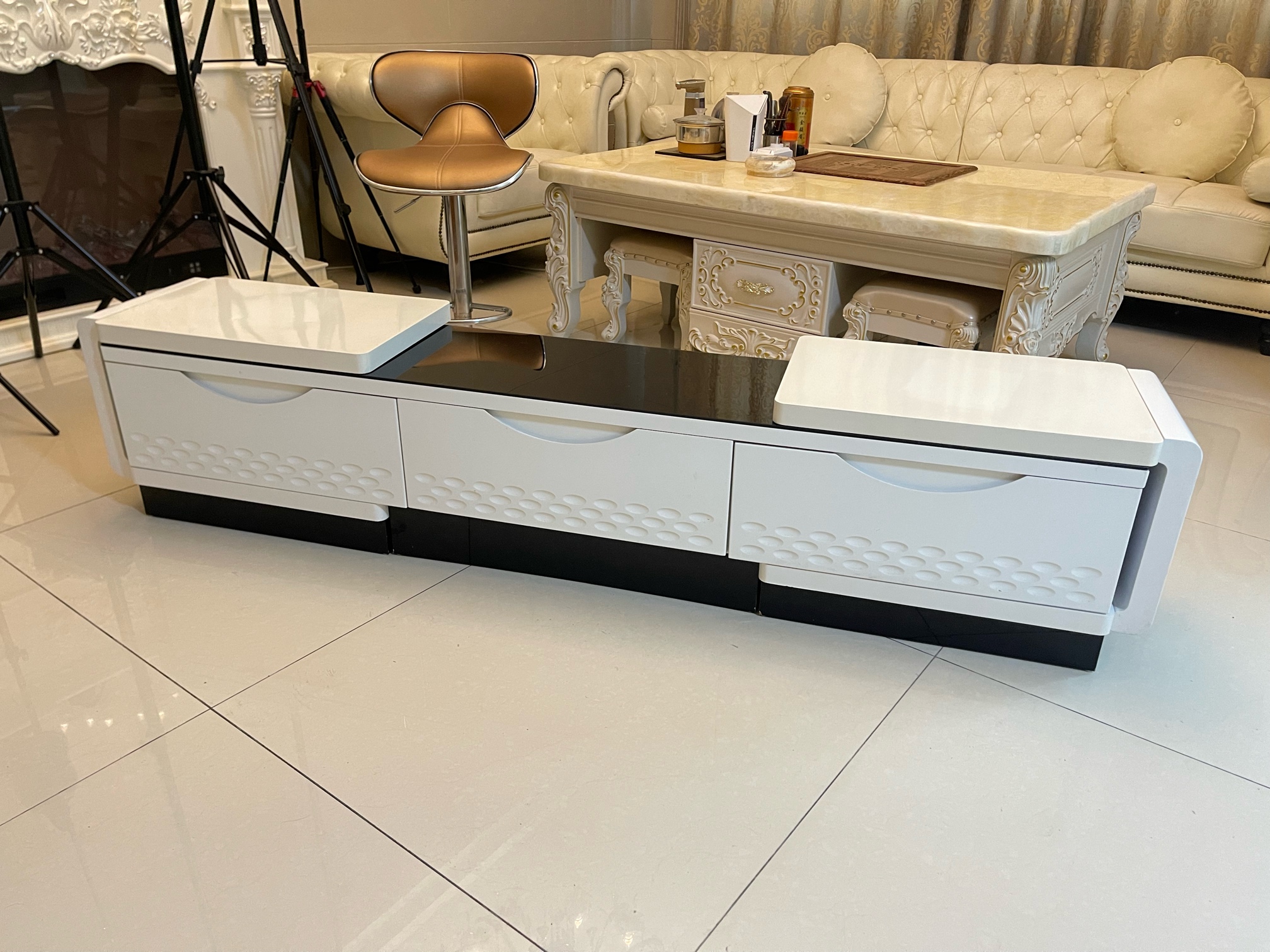 这款电视柜造型别致,它是可以拉伸的,很有意思,它可以在1.9米和3米之间任意伸缩,可以解决一部分用户的痛点。