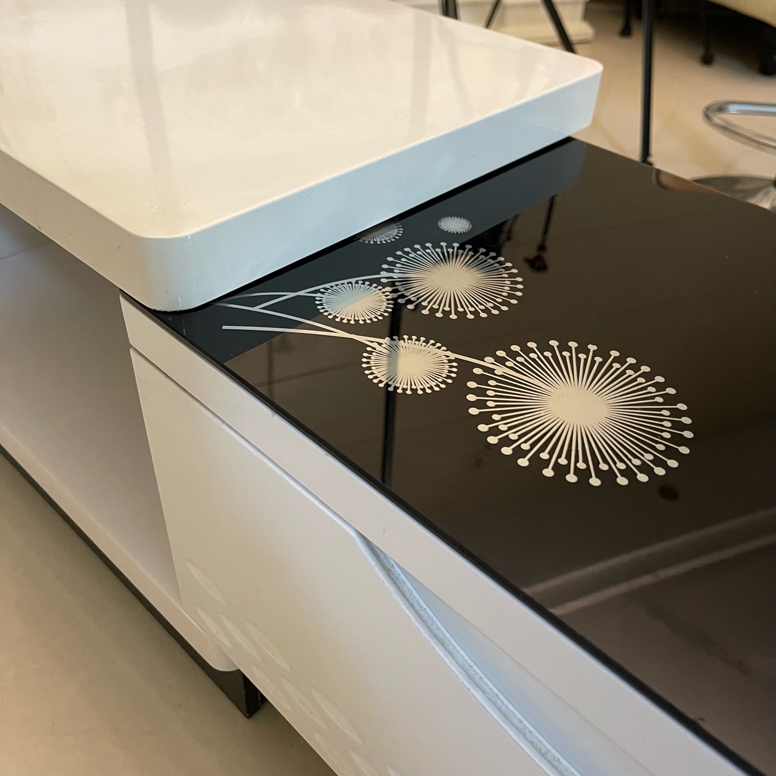 钢化玻璃台面,储物功能强大,除了自带三个大抽屉意外,两边拉伸部分也可储物(放点书简直美呆了)