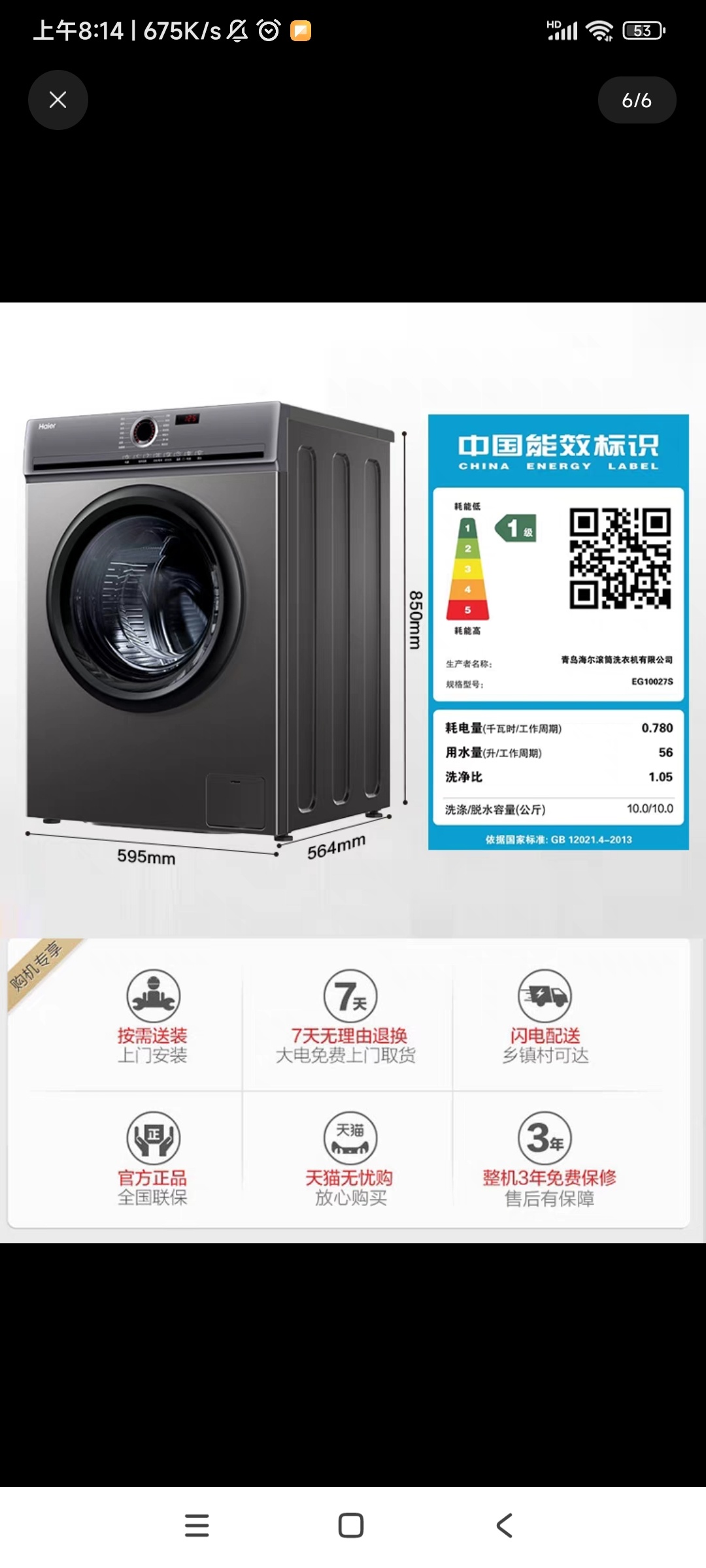 海尔全新10kg洗衣机。900出