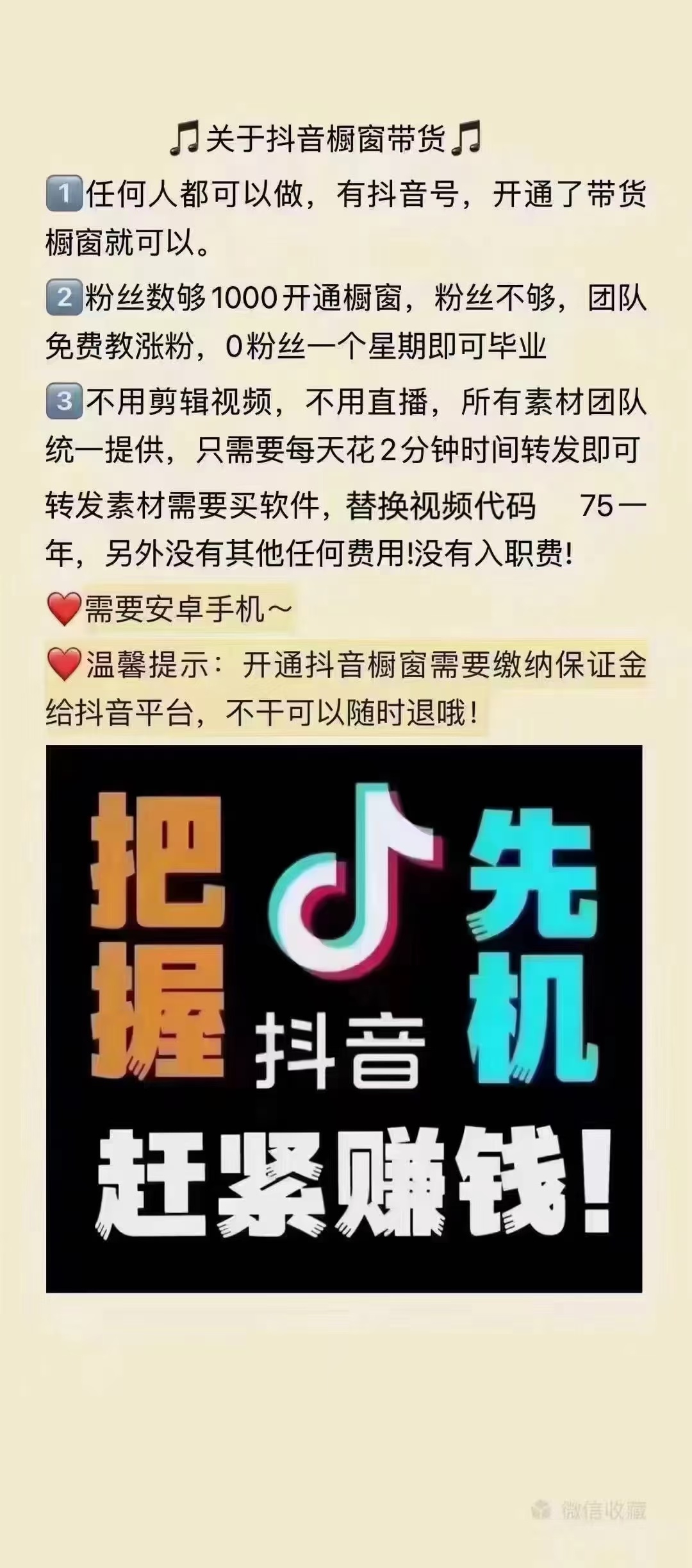 我们是做抖音橱窗带货的,开通橱窗出单你就拿佣金,群里都有素材,你跟着做就可以了,我们免费教你,没有粉丝也没关系我们免费教你涨粉,感兴趣的可以加V了解一下gyq52lwf