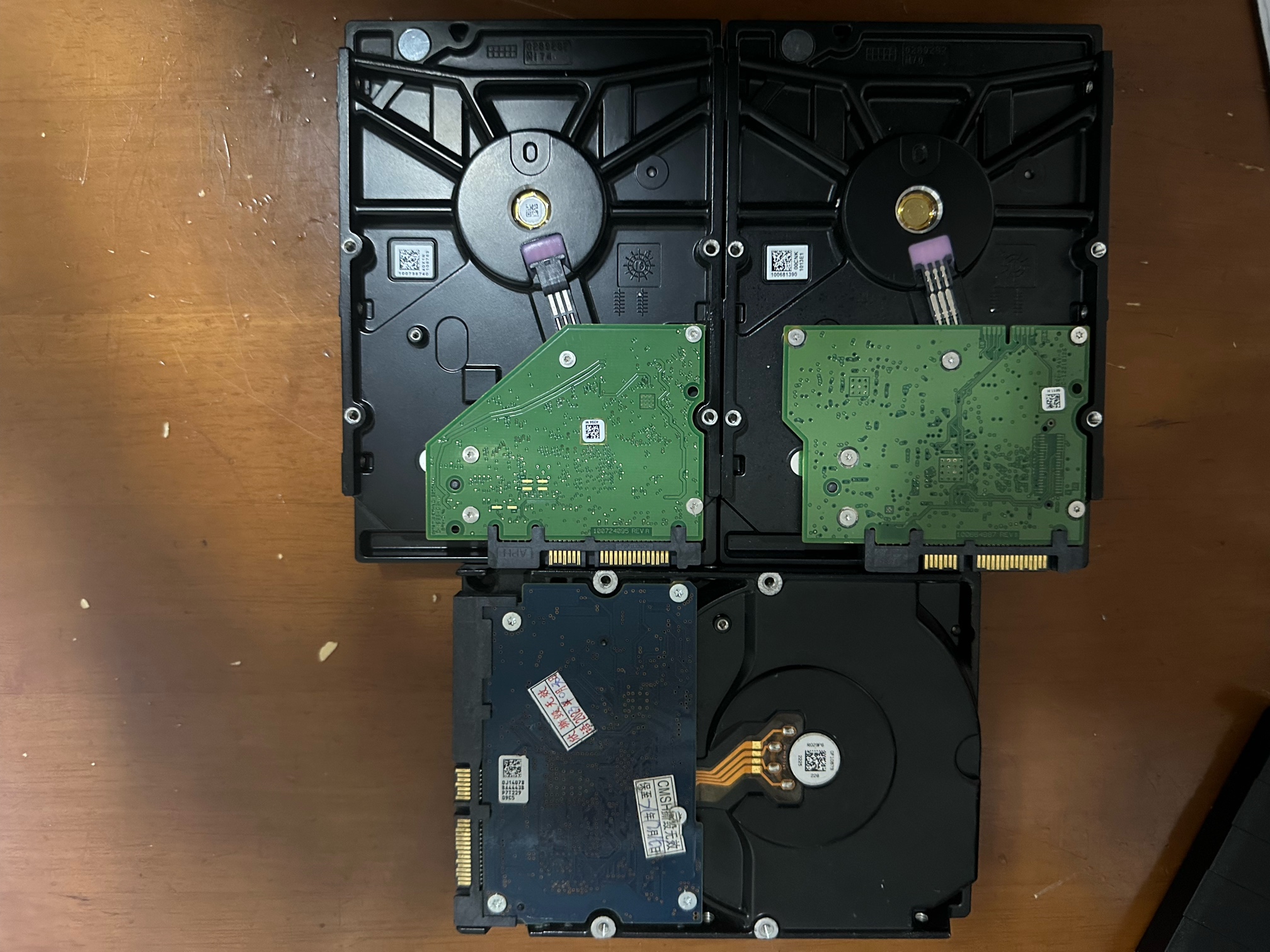 出三块存满东西的3TB台式机硬盘。