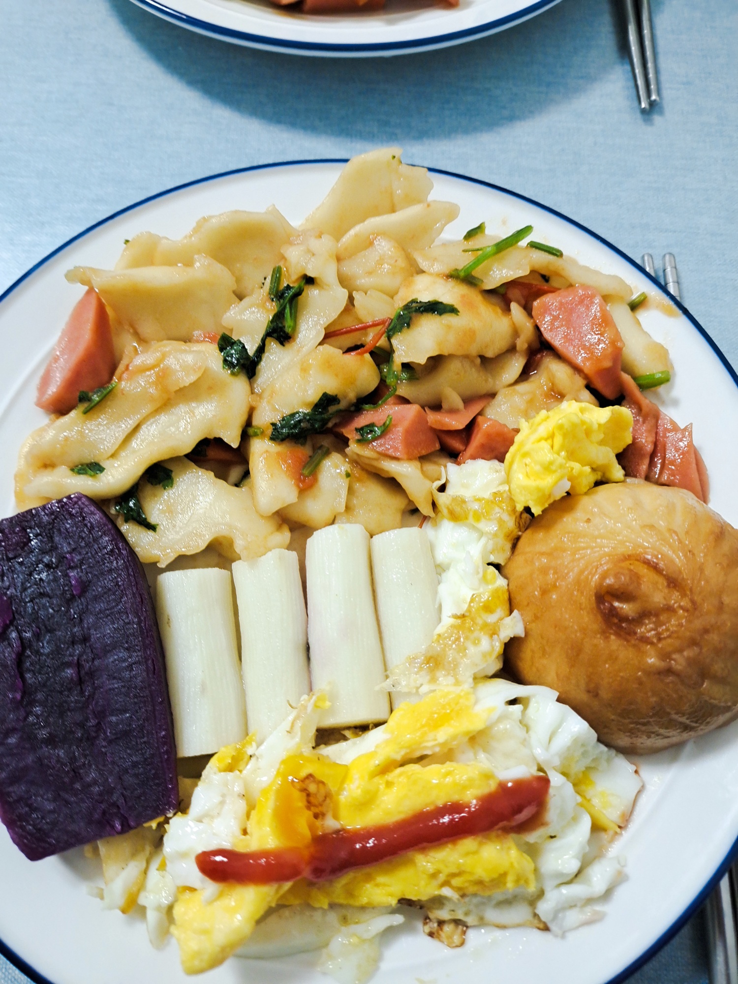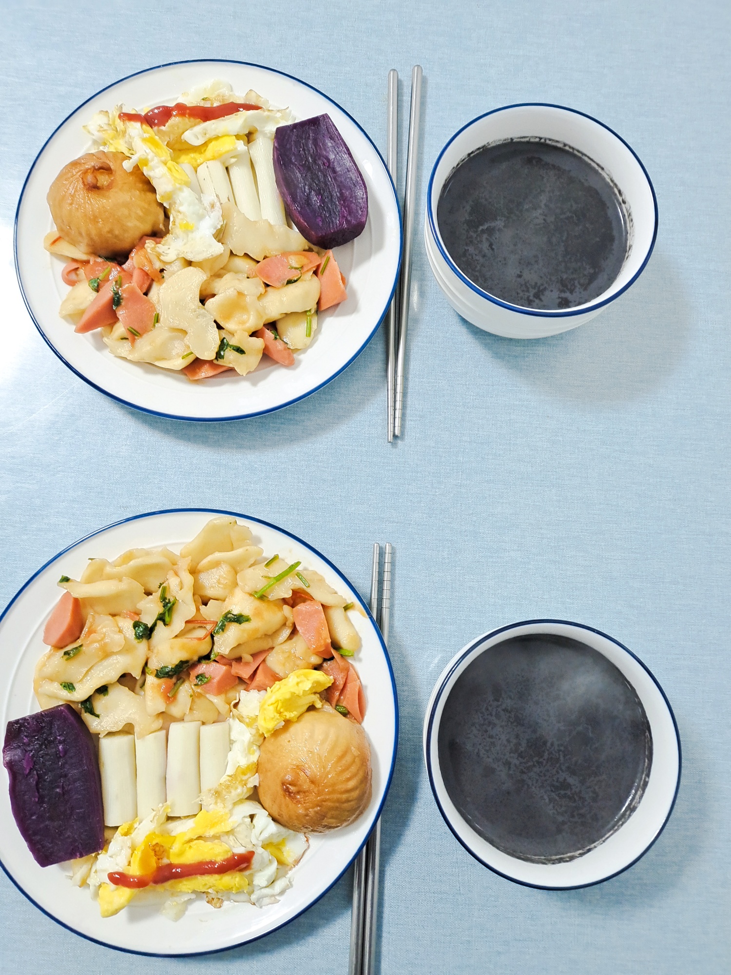 今日早餐:黑芝麻糊,紫薯,山药,炒面片,煎鸡蛋。