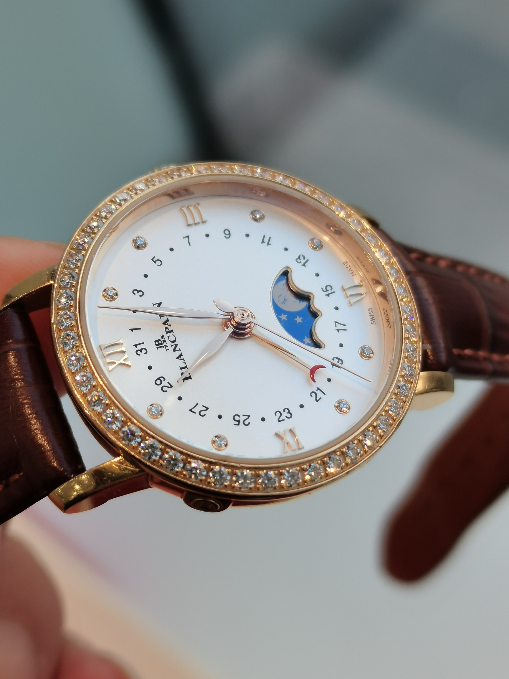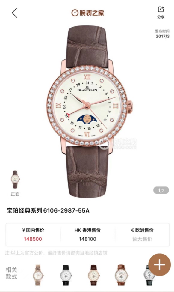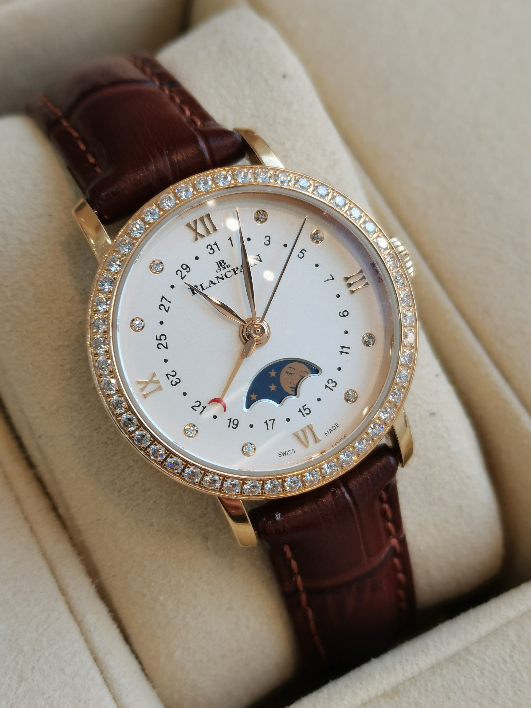 宝珀月亮美人 经典系列6106-2987-55A 女士腕表 自动机械 表径29.2mm 白色表盘 镶钻时标 日期显示 月相功能 原镶钻 全套 专柜价148500 现好价