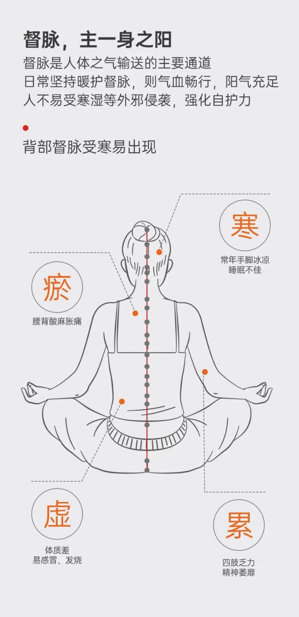 想补益人体的阳气,要疏通温暖两条经脉。我们人体阳气最足的经脉是督脉,其次是膀胱经,这两条经脉主要循行在人体的后背,督脉走在正中间,从尾骨沿脊柱一直上行到颠顶,然后下行经过印堂鼻梁止于上牙龈。