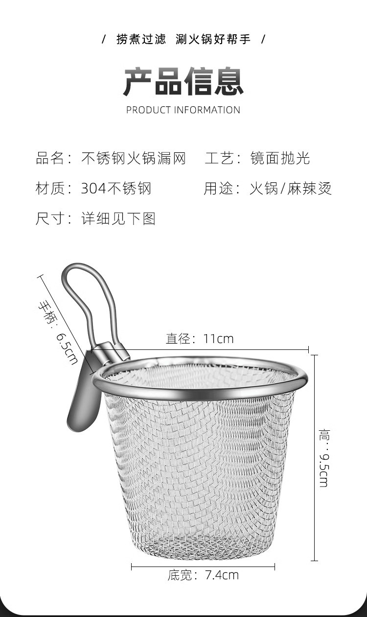 304不锈钢材质,细密漏网。清洗方便