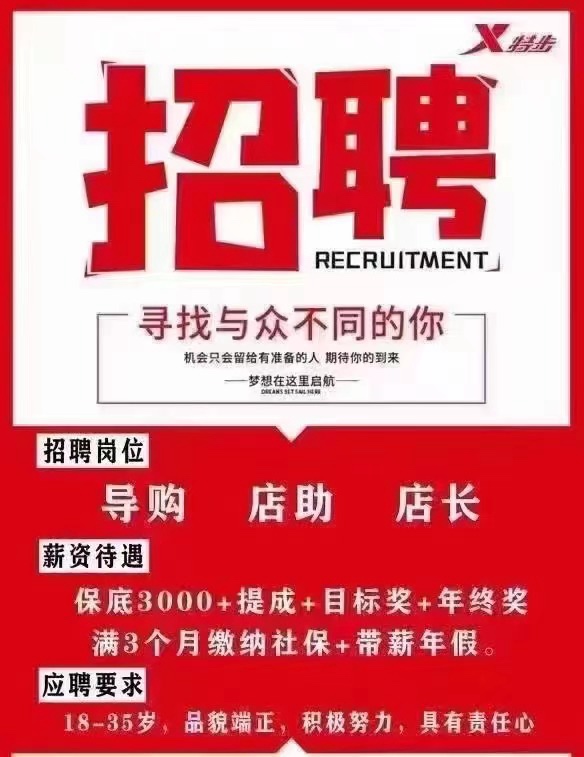 江阴市高巷路特步专卖店,招小姐姐啦!薪资4000-8000(上不封顶),底薪加提成加奖金,年底有年终奖,招聘要求:18-35岁。联系人李女士18861652657