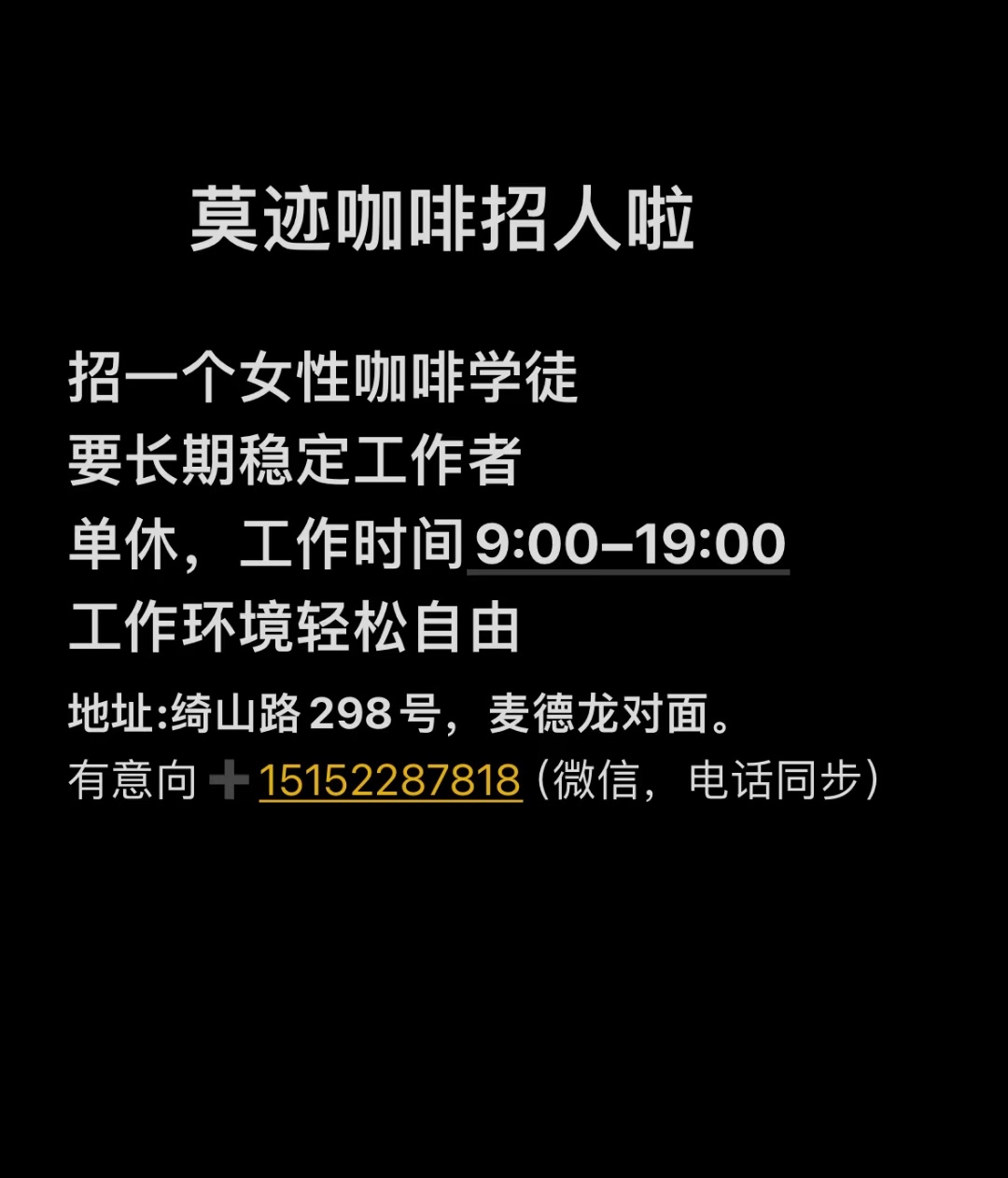 招聘咖啡师学徒,地址江阴麦德龙对面,有意联系15152287818