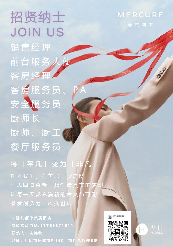 法国雅高&华住酒店旗下江阴美居酒店新店筹建招聘啦!