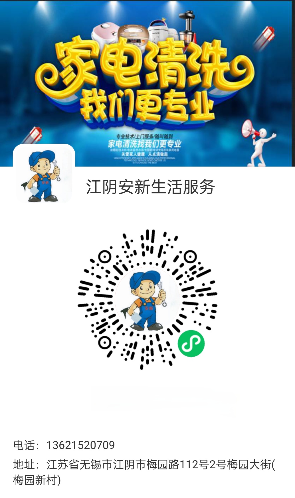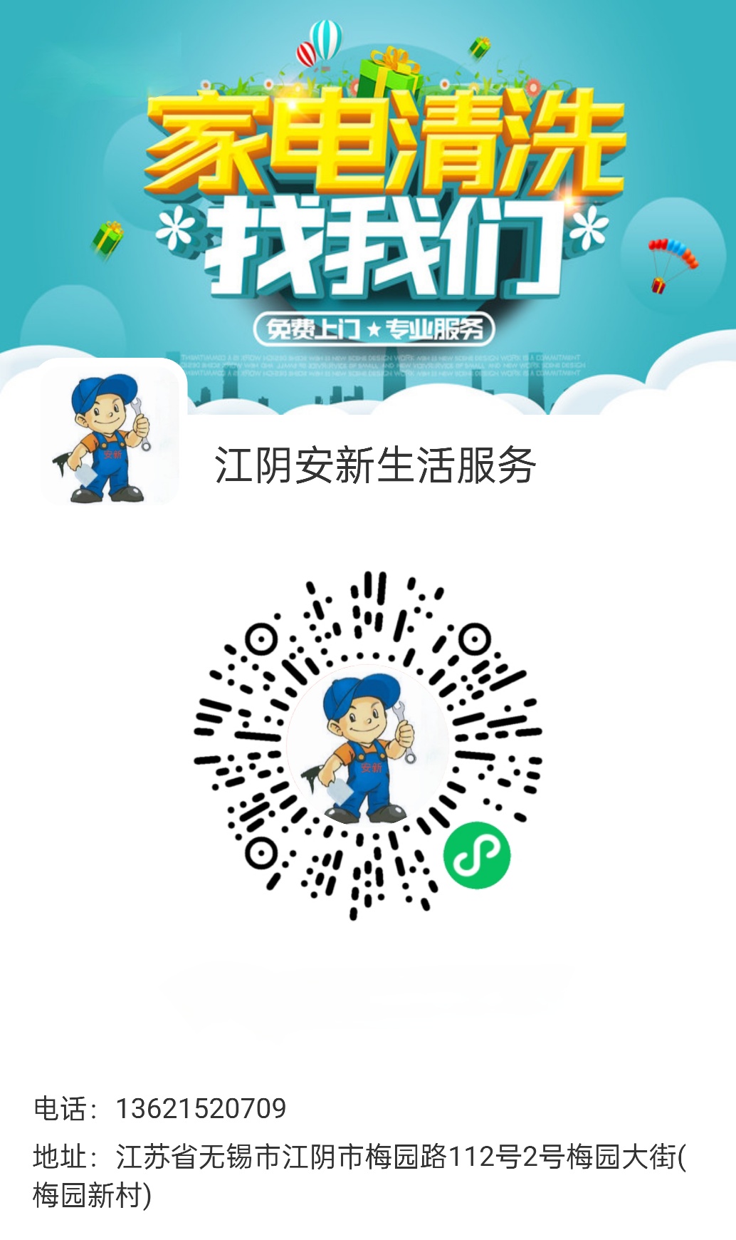 安心生活服务,有家电清洗维修的,请扫码下单,本月有多项优惠政策