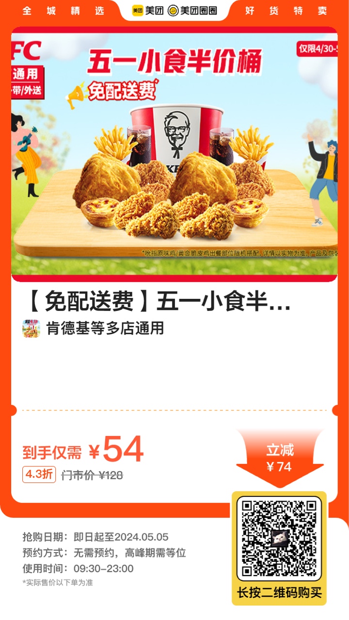 【肯德基|【免配送费】五一小食半价桶|多店可用】