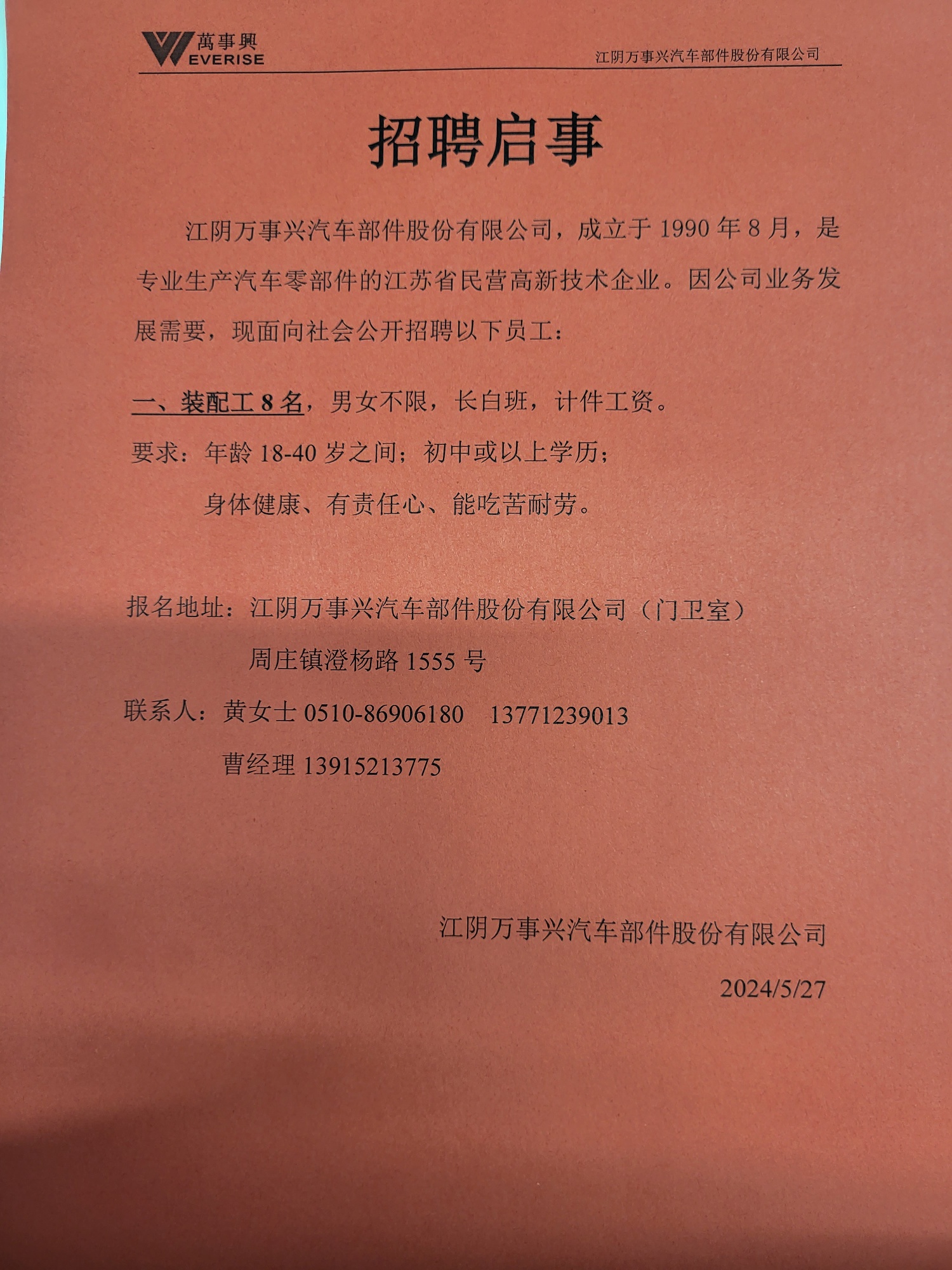 江阴万事兴汽车部件股份有限公司,成立于1990年8月,是专业生产汽车零部件的江苏省民营高新技术企业。因公司业务发展需要,现面向社会公开招聘以下员工: