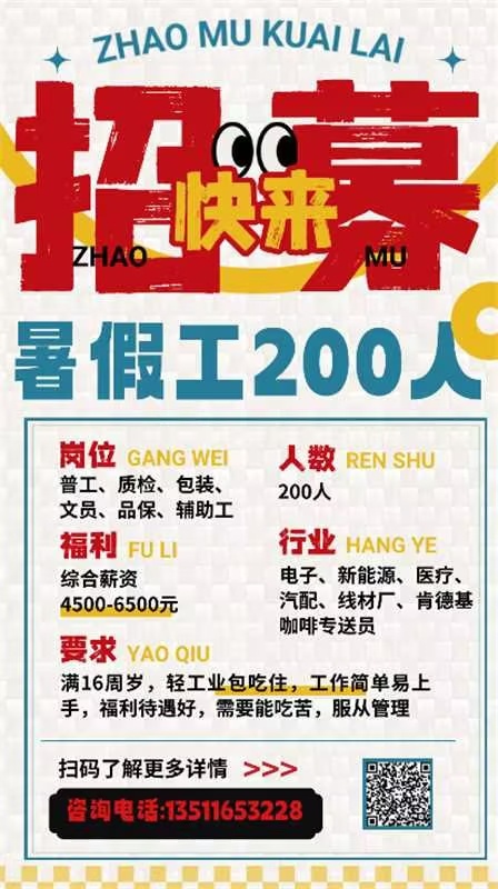 假期工找工作,面试,只要不挑,想做,包进(两班倒,长白班都有)16-55岁,男女不限,月入4500~6500