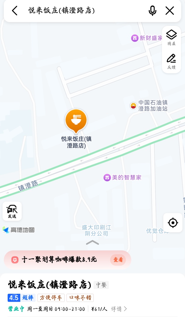 地址:江阴市镇澄路100号 ,万达西面500米【悦来饭庄】