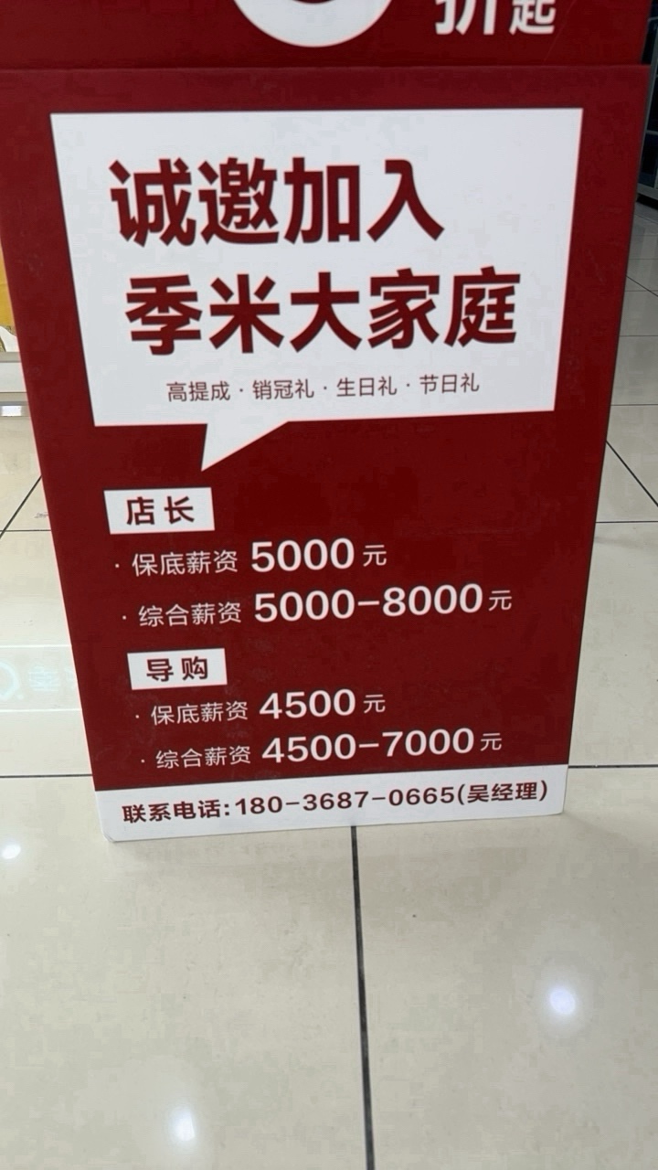 早班7.30到3.30,中班10点到6点,晚班2点到10点,月休四天,地址延陵路大润发一楼季米家居。试用期保底4500一个月
