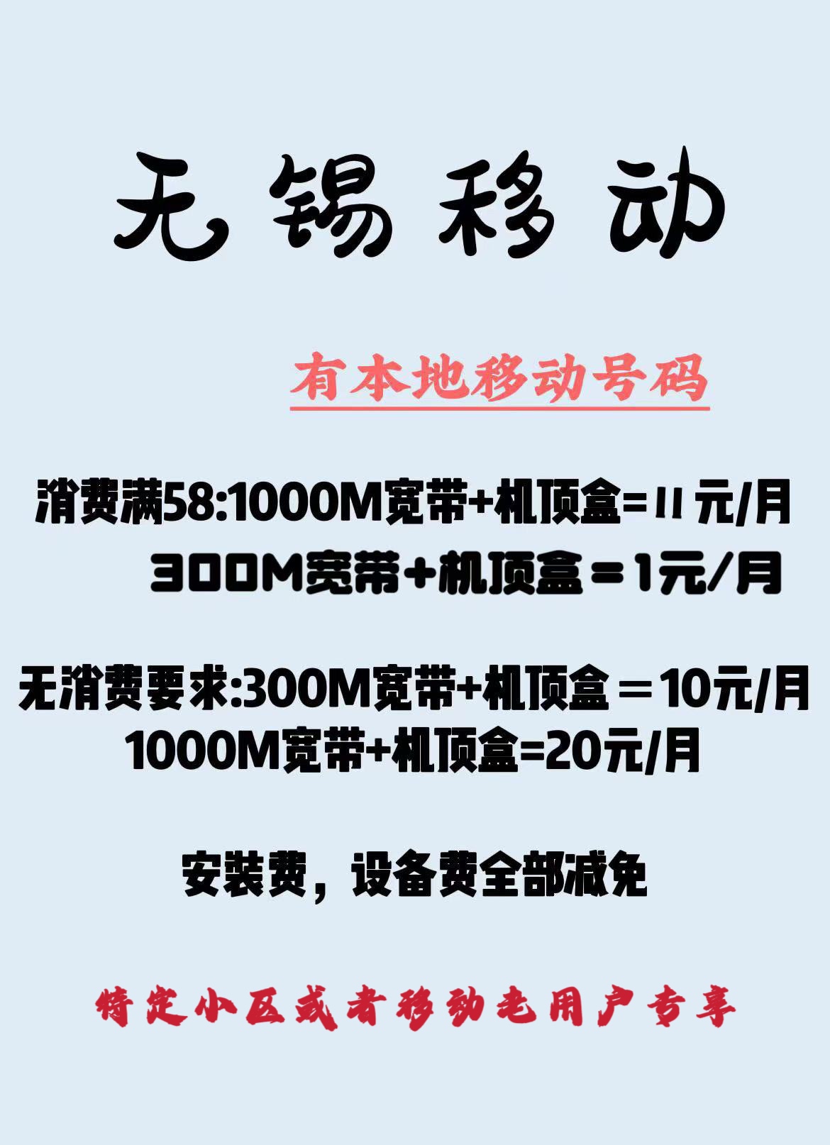 无锡移动号码宽带销户后 ,重新装算不算新户安装? 要求无捆绑无限制消费,10元/月,安装300 M宽带就可以。