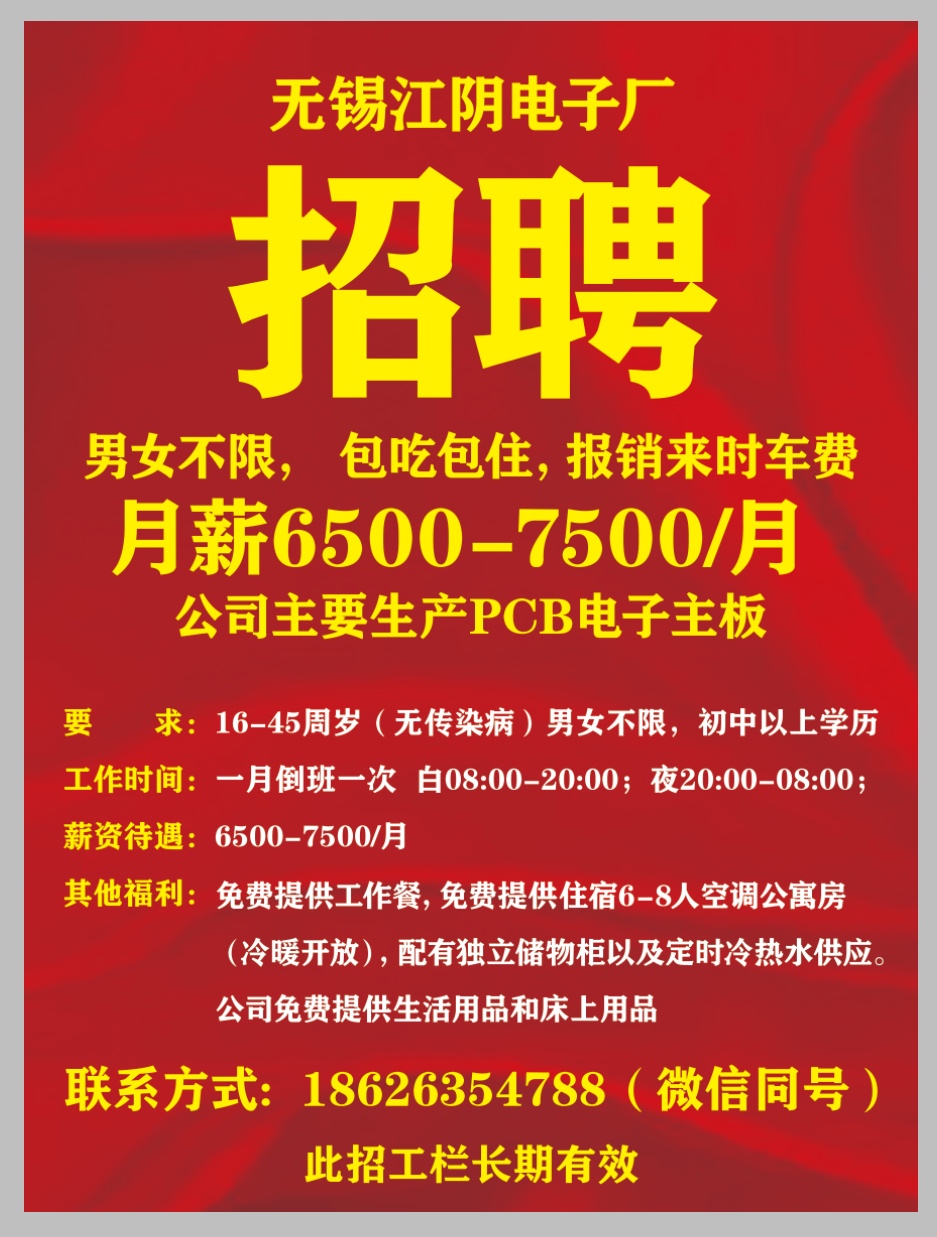 工厂直招】江阴长山电子厂招聘普工
