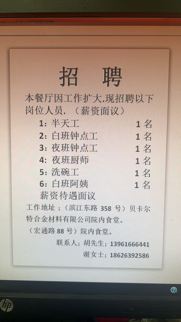 工作地址 滨江东路358号和宏通路88号贝卡尔特内部食堂