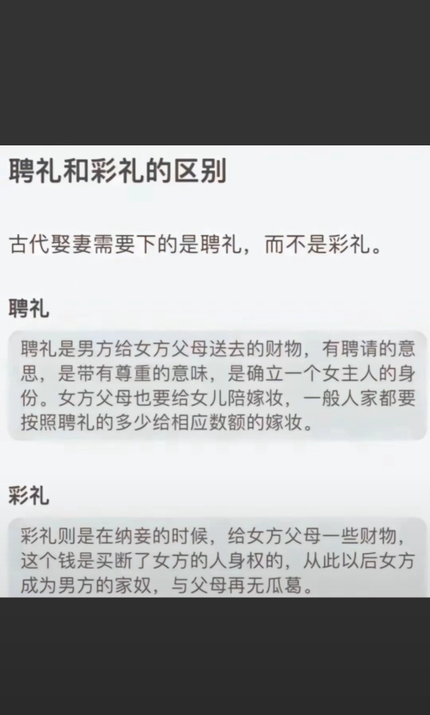 聘礼是有陪嫁的,彩礼是卖身没有陪嫁的,是不是这意思