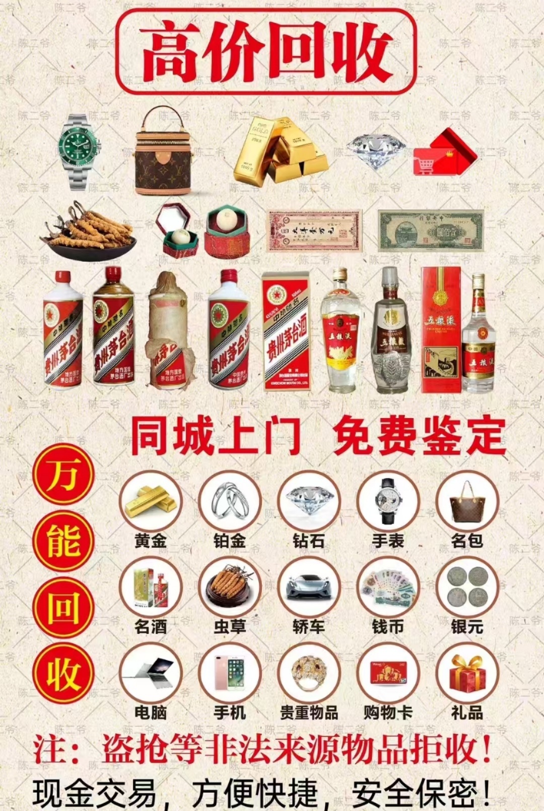 【汽车 名表 名包 首饰 黄金 钻石 珠宝 名酒 名烟 手机 高端数码产品等各类贵重物品】