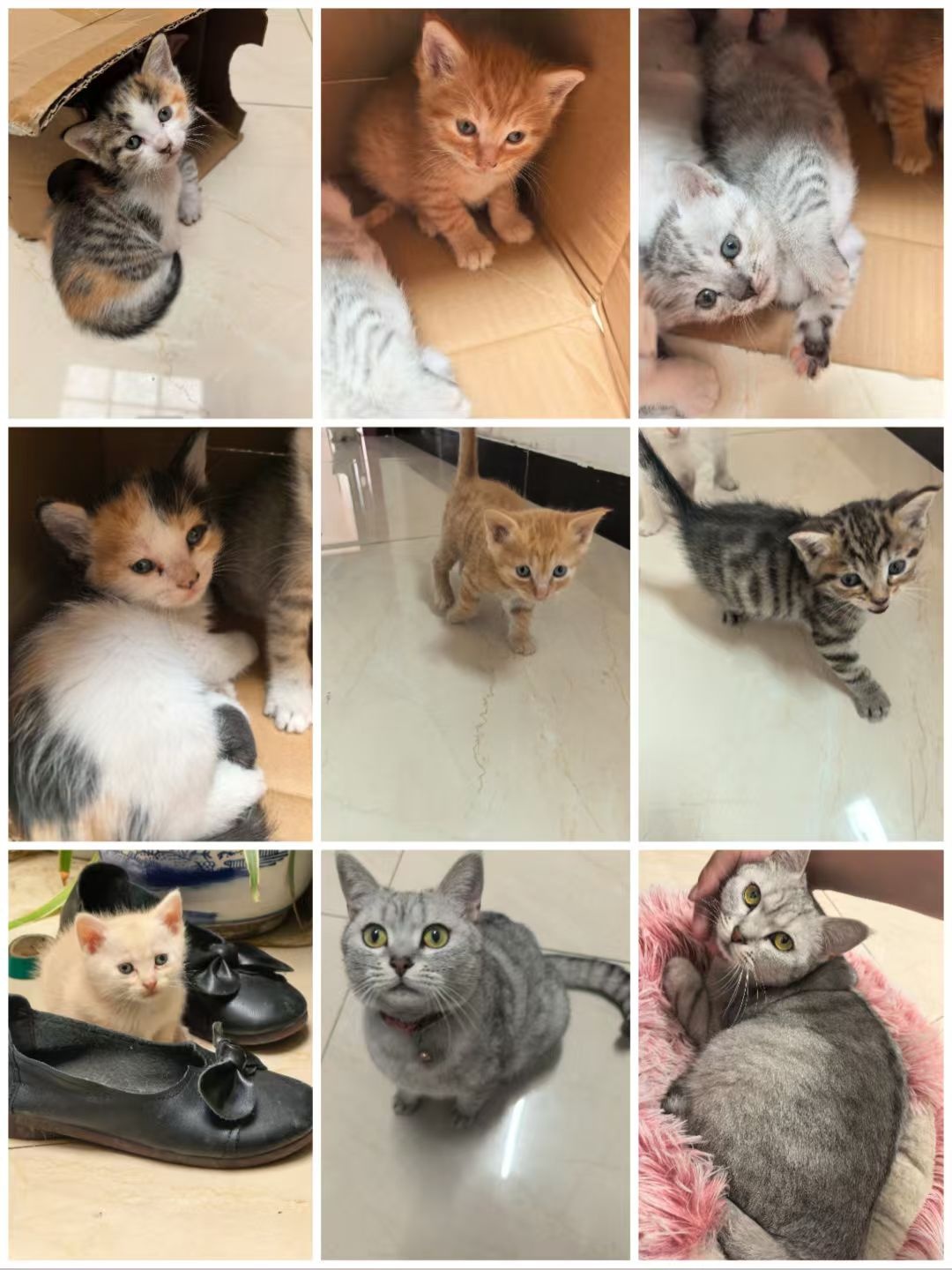 小猫求领养,家里大猫一窝生了7只串串,图2和图6都是公猫,其他都是母猫。图7奶黄猫胆子最大。图8,图9是猫妈妈,银渐层。小猫基本已经断奶,身体倍棒。江阴本地可自提,无锡离得近我也能送。