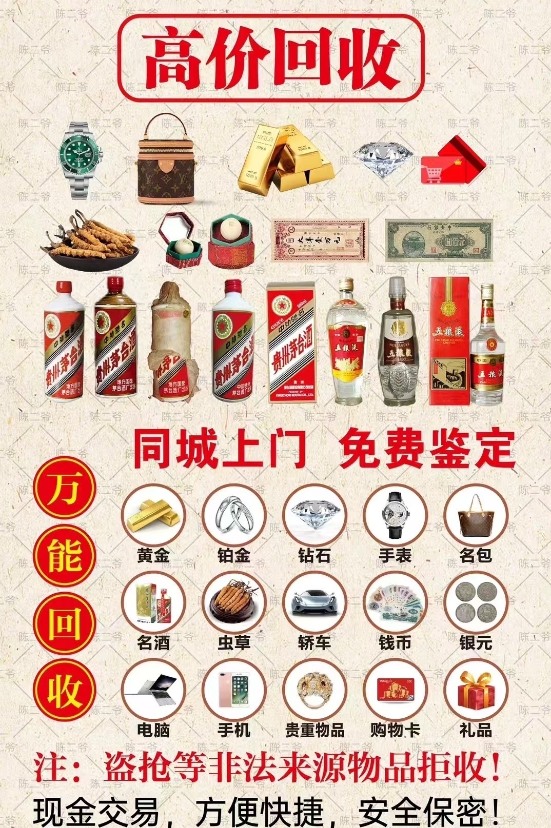 【汽车 名表 名包 首饰 黄金 钻石 珠宝 名酒 名烟 手机 高端数码产品等各类贵重物品】