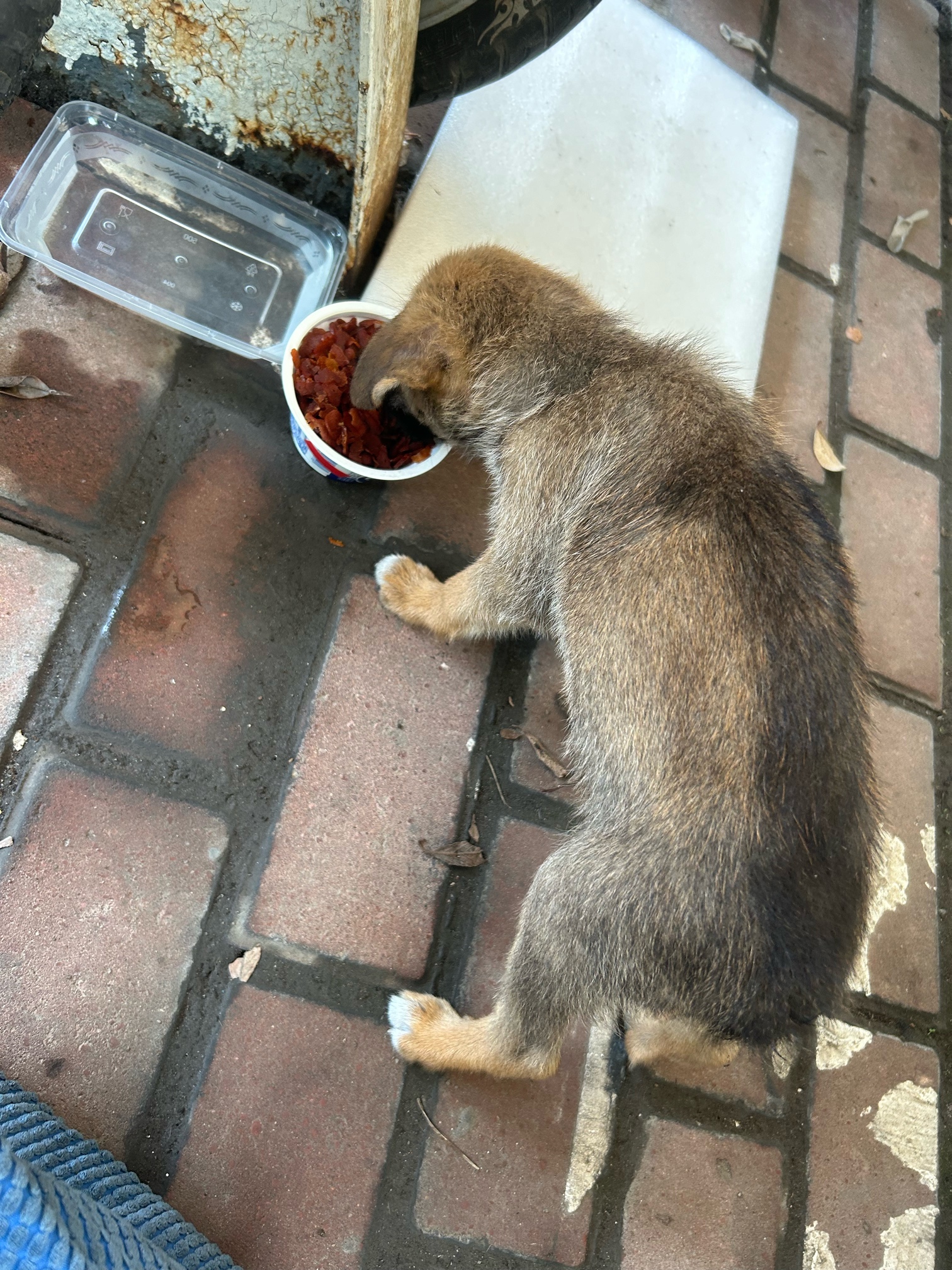 华士医院电动车车棚,估计有人扔掉的,有垫子在,昨天看到在那里,今天还在那里,估计在等主人,我给它吃了点粮和水,希望好心人领养,公狗,黄黑色!
