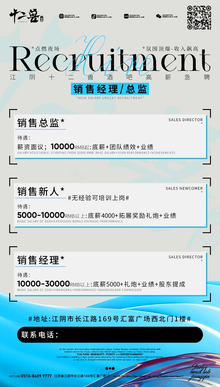点燃夜场! 江阴十二兽酒吧高薪急聘销售经理/总监氛围顶爆,收入飙高,等你C位出道速撩15852662254小宝