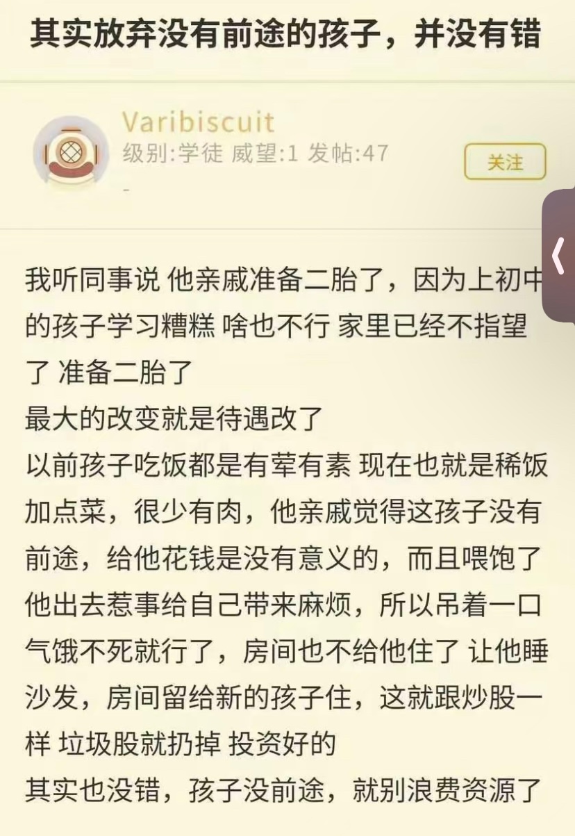 如果把孩子当成一个商品,卖不出好价钱,不投资无可厚非,不过前者是个人啊,养个宠物也不至于此