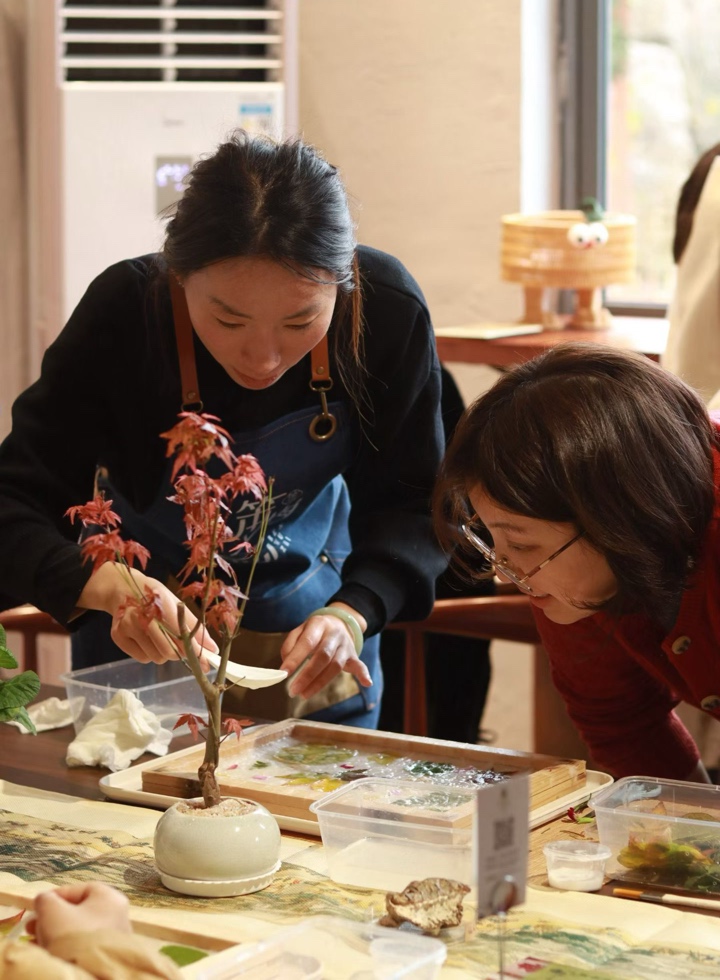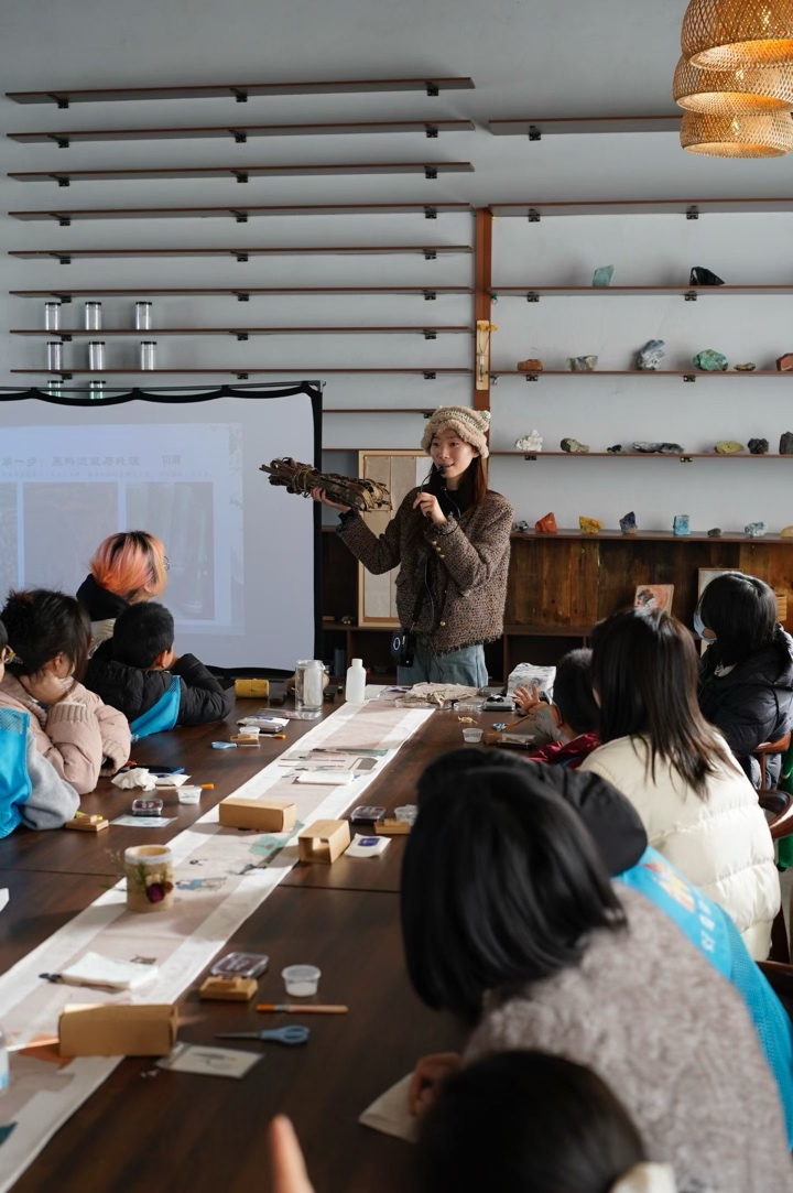 店主小姐姐超有耐心,先带着孩子逛展科普,再讲解东汉蔡伦改进造纸术的故事,从树皮、木料这些天然原料,到古人历经数十道工序造纸的智慧,孩子听得眼睛都亮了,连我都跟着补了堂生动的传统文化课。古法造纸体验真的太有意思了!从捣浆时的咚咚声响,到用木帘小心翼翼抄纸的专注,再到挑选干花、绿叶在湿纸膜上创意排版,每个步骤都充满仪式感。原本以为简单的操作,实则超考验耐心,