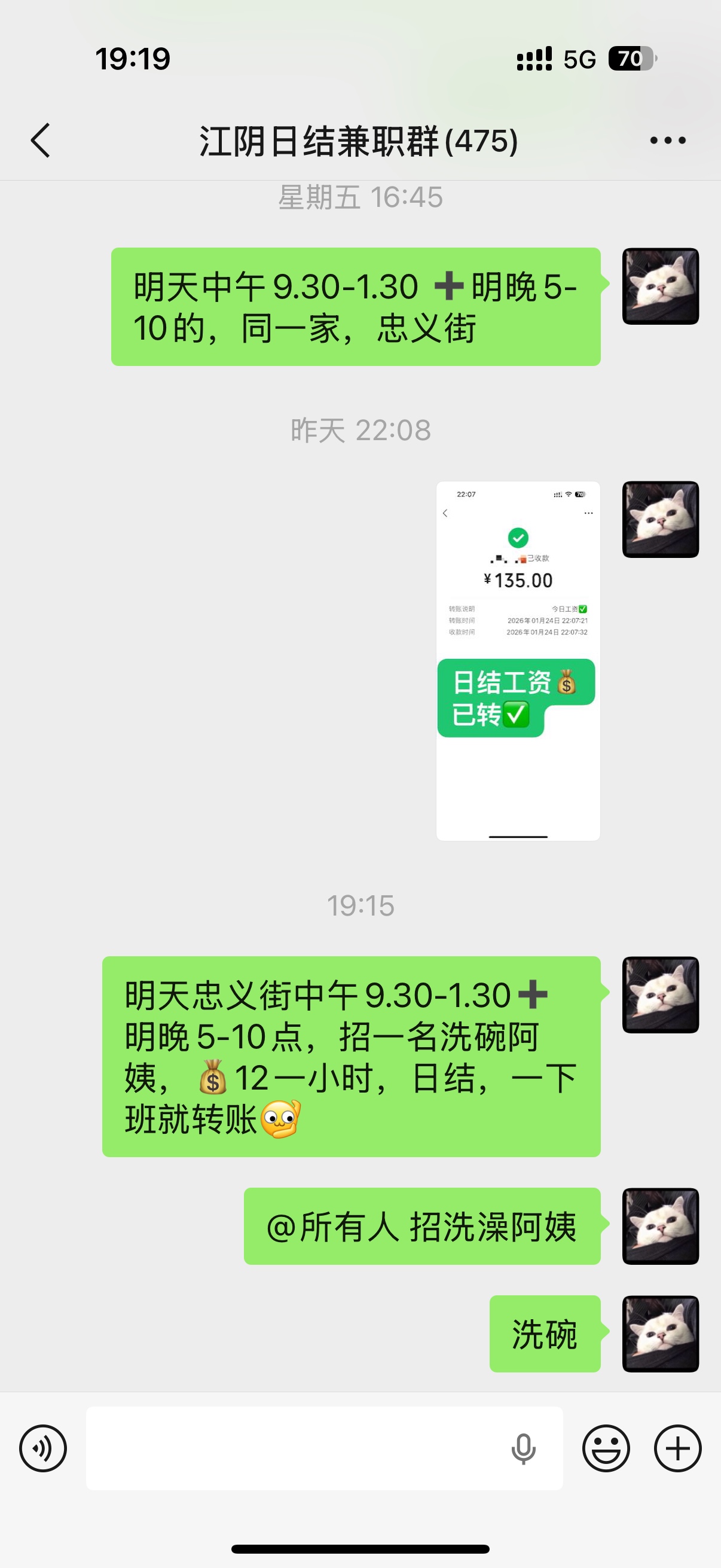 明天忠义街中午9.30-1.30明晚5-10点,招一名洗碗阿姨,12一小时,日结,一下班就转账,愿意做的加,ZF474895708
