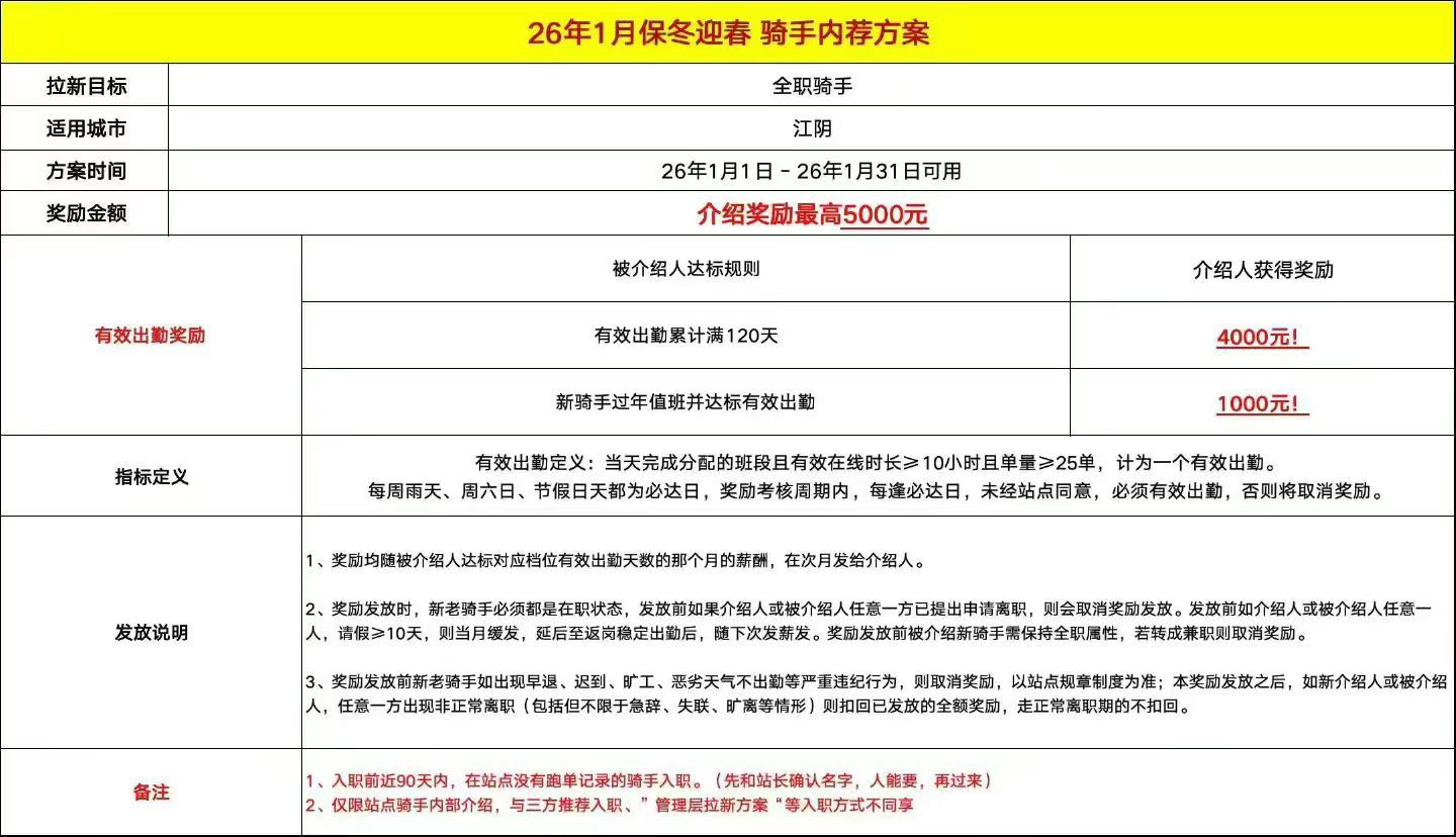 现江阴全城招收全职/兼职骑手,在专送离职90天以上可享受5000[礼物]元回流奖励,在职骑手介绍新人入职可奖励5000/人[礼物](不封顶,多介绍多得奖励)
