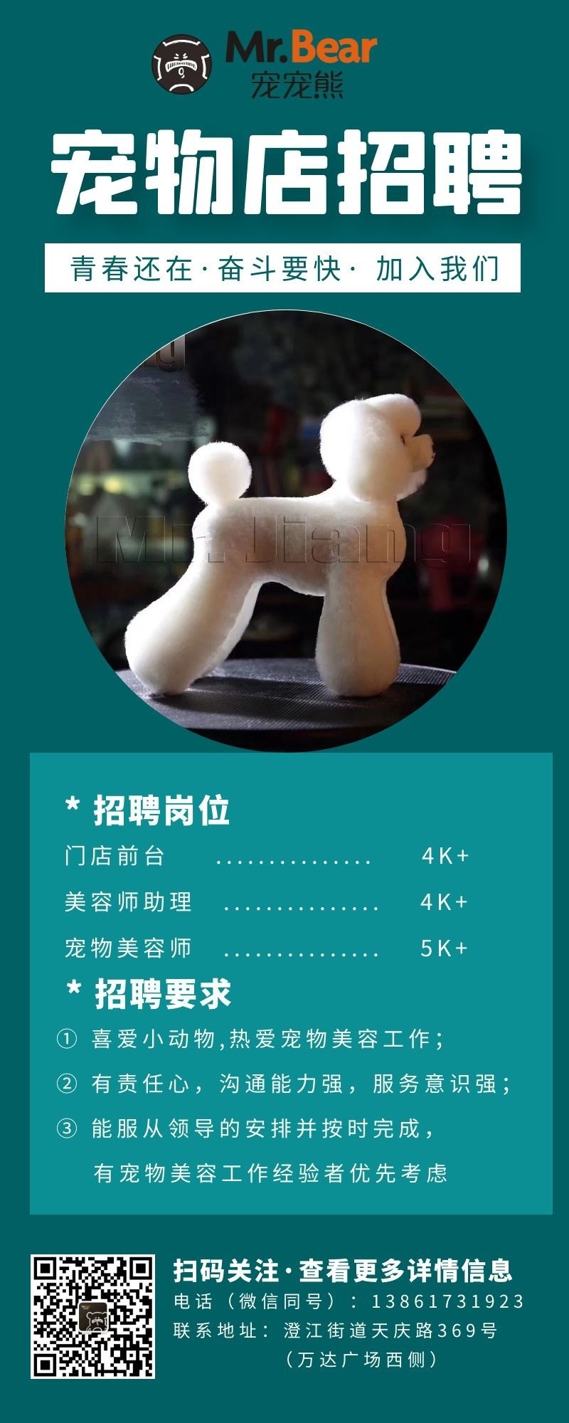 1、有爱心,性格开朗,待人和善,服从领导安排,对工作认真负责,有意愿从事宠物美容;有相关行业经验者优先。