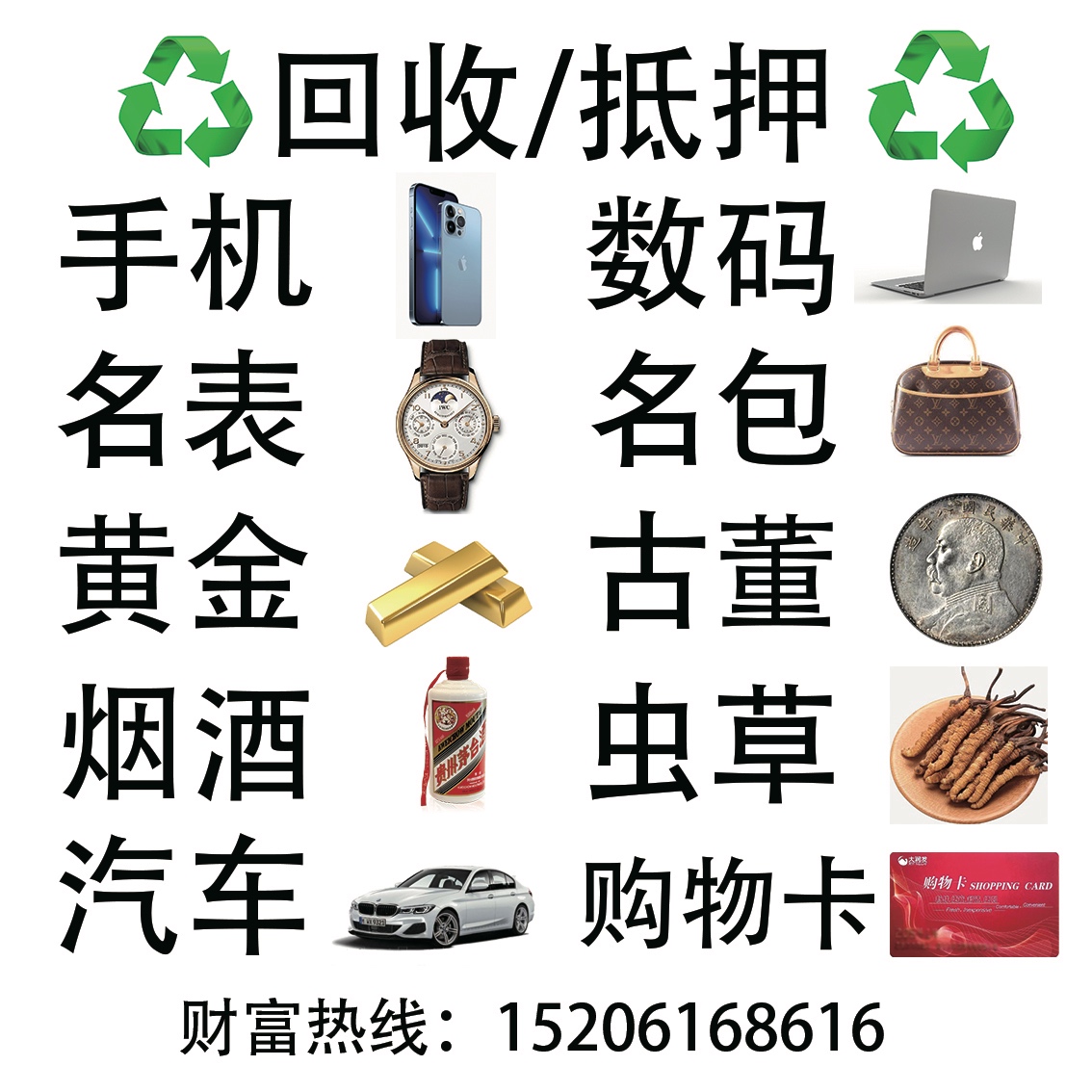 六六商贸—电话/微信15206168616;回收/抵押:手机,数码,香烟,老酒,黄金、白银,铂金、珠宝、名表,名包,钻石,古董,汽车,虫草,礼品,购物卡,奢侈品……地址:江阴市澄江街道寿山路58-1号实体店